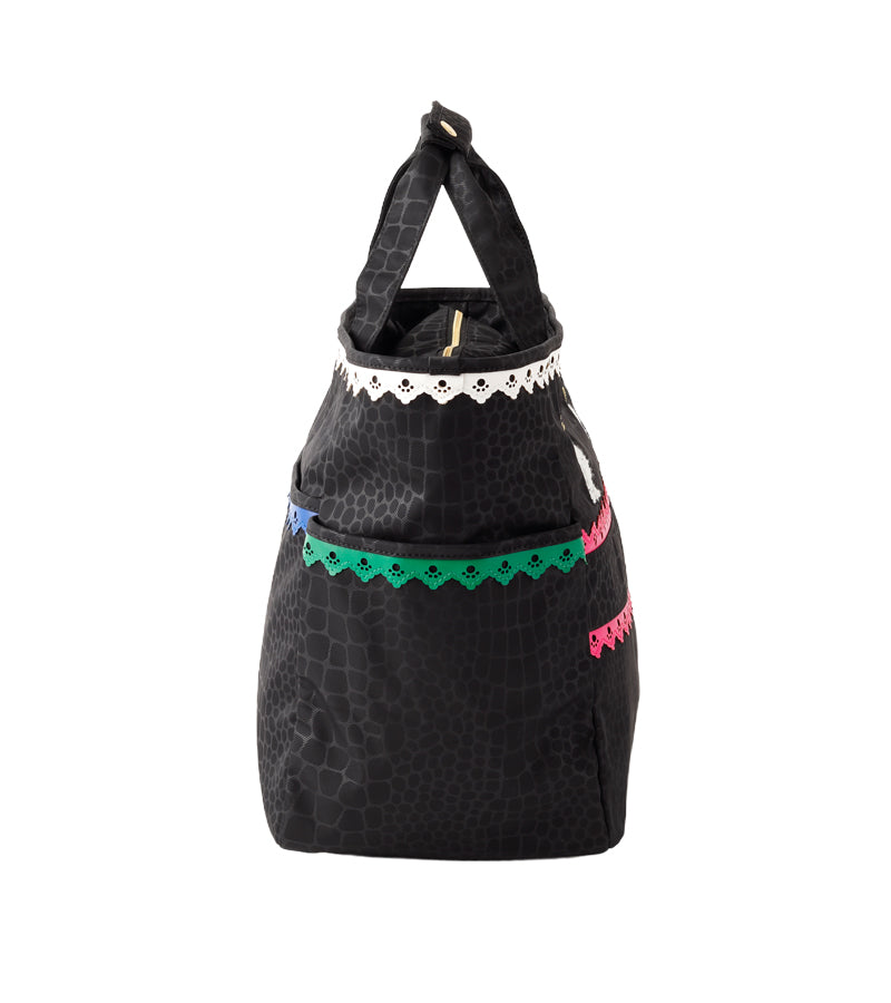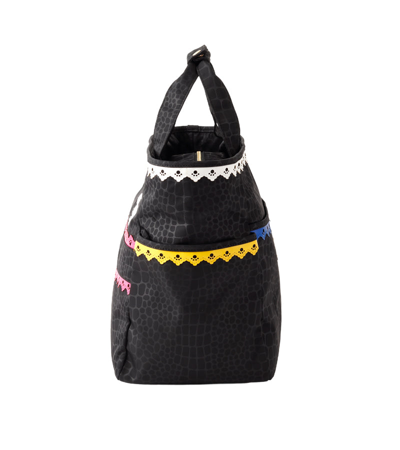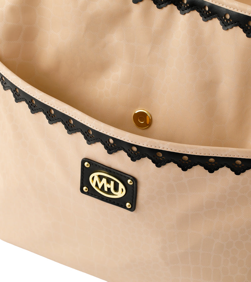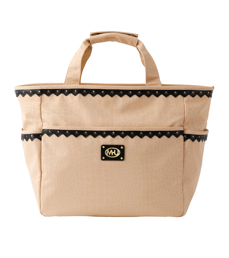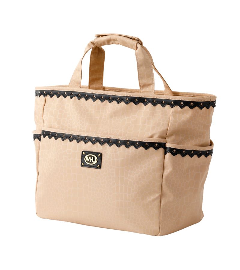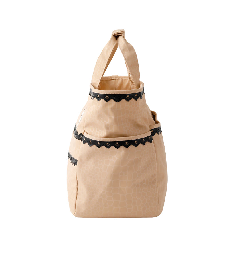 アニマル柄のエンボス加工された撥水素材ポリエステル生地と、配色のパンチングレース使いが特徴的なトート型ボストンバッグ。
