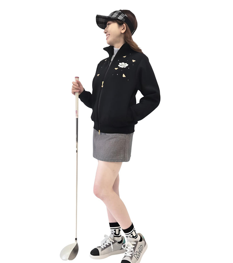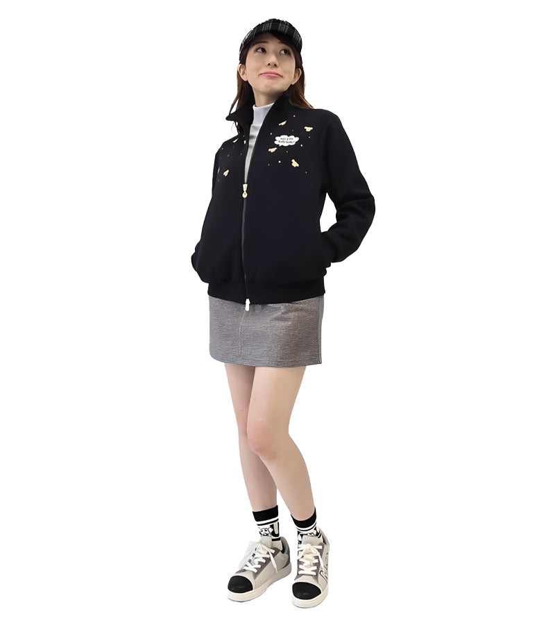 スポンジを挟み込んだような張り感と軽さが特徴のダンボール素材の生地にキャラクターをゴールド、ラインストーン風にシルバーで刺繍を施したフルジップの羽織ブルゾンです。