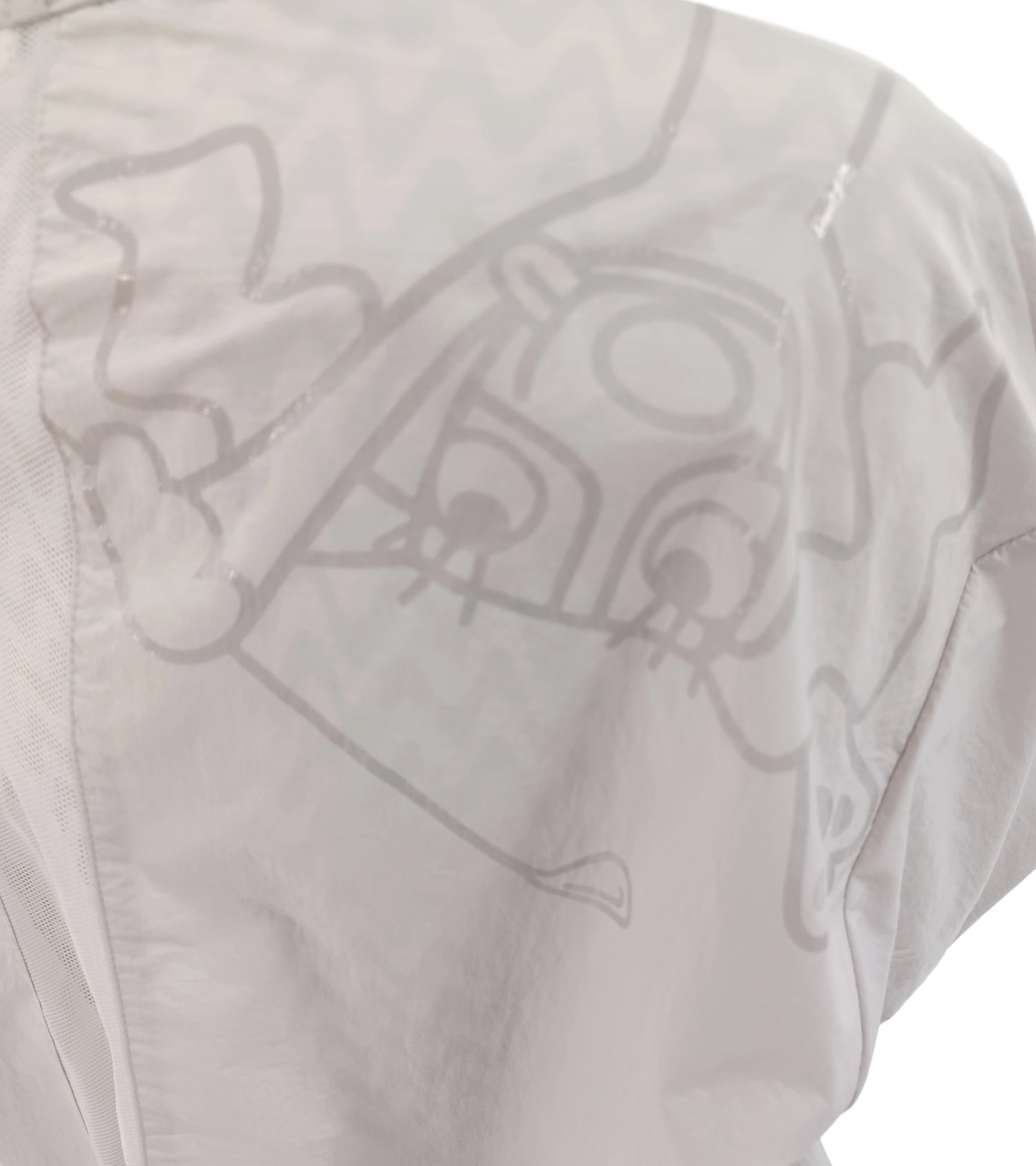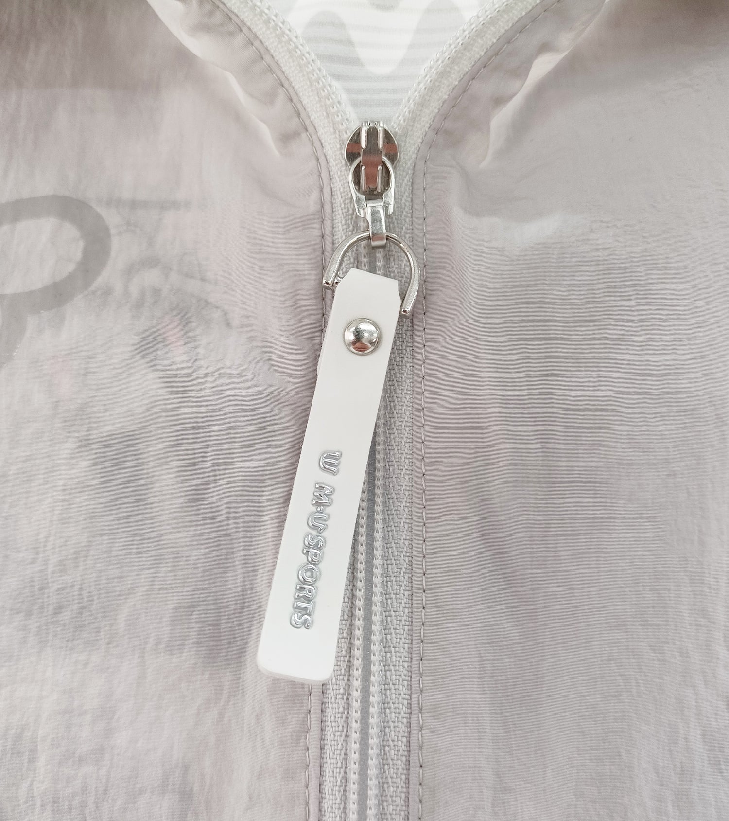 素材は撥水性があり、簡易レインとしても使用できます。また春先汗ばむ暑さにも接触冷感性機能が活躍し、快適にお過ごしできます。背中センターにメッシュ素材を使用しておりベンチレーション機能もございます。ファスナーヘッドはオリジナルロゴを施した仕様です。