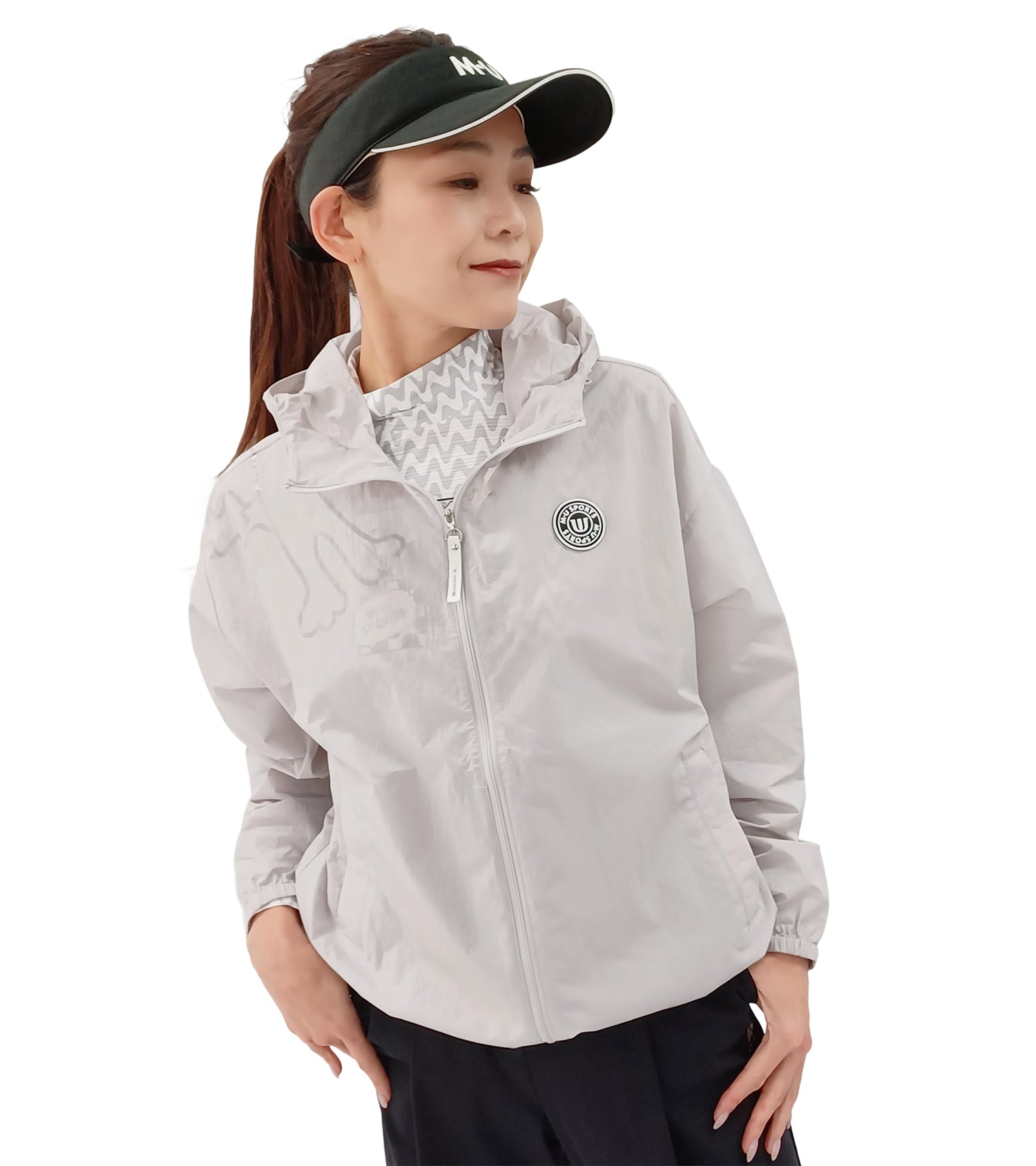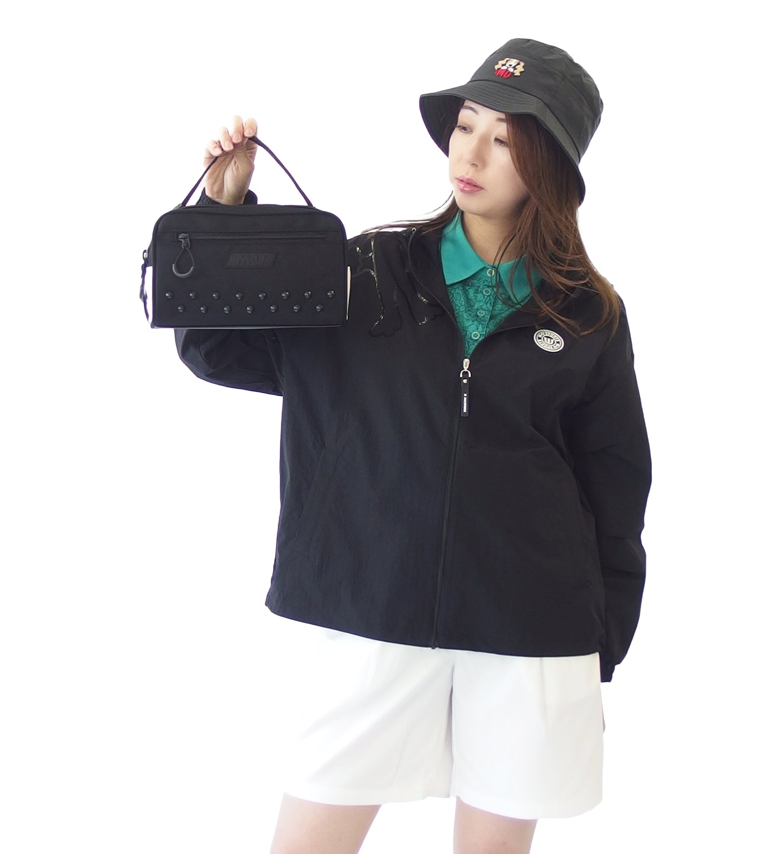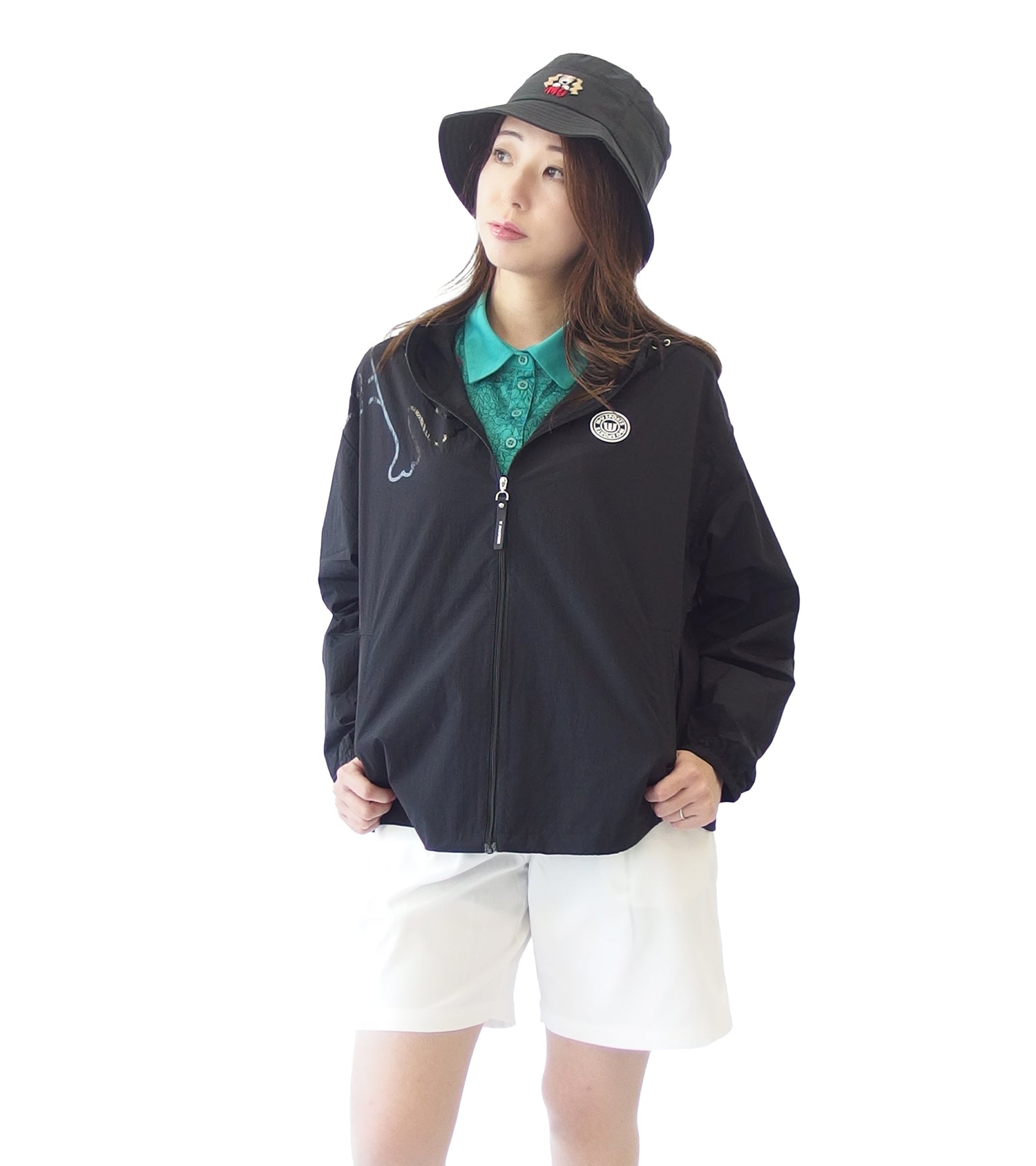 ゴルフを楽しむキャラクターが右ショルダーの前後に大胆にあしらったゆったり長袖ショートブルゾンです。