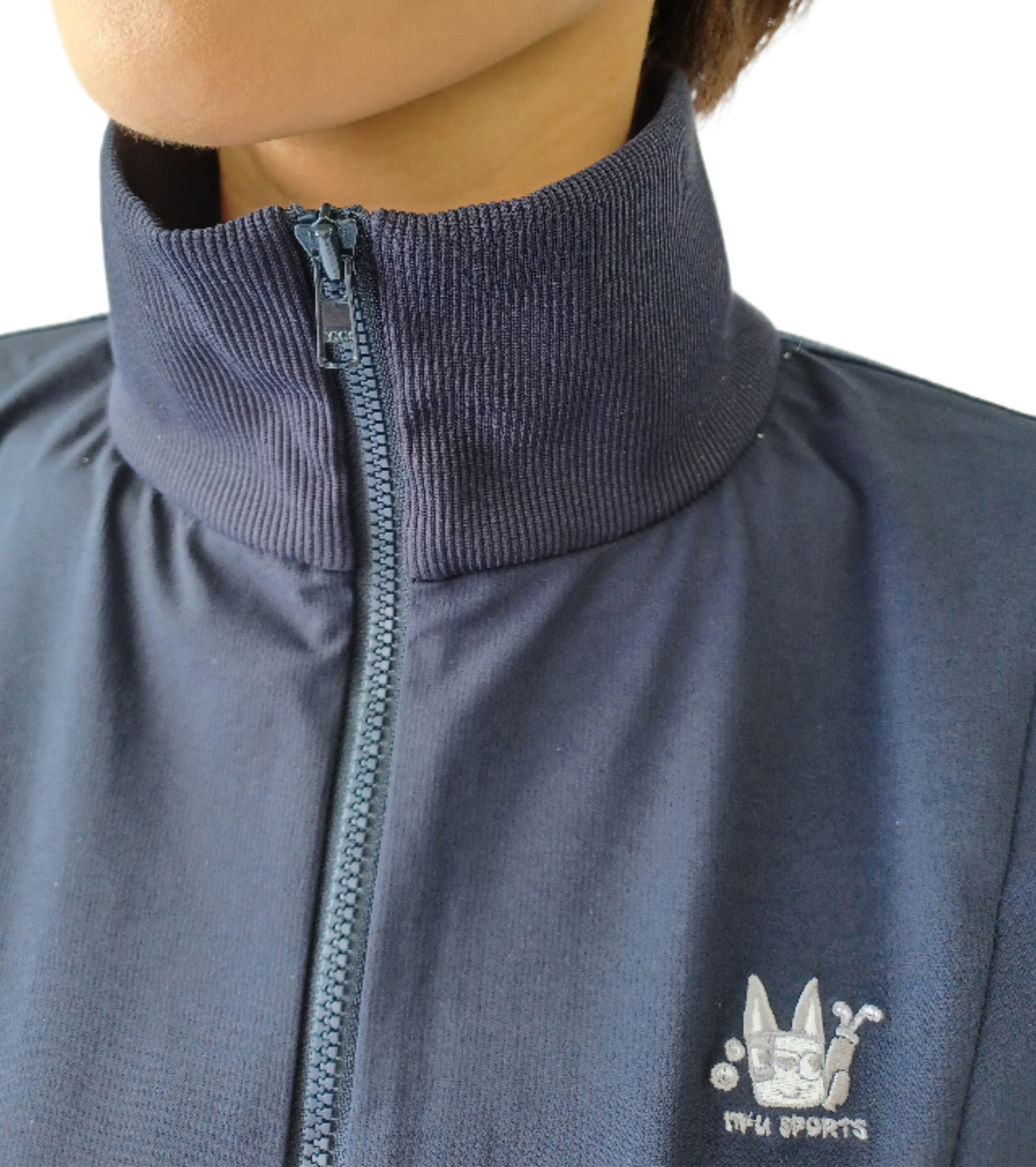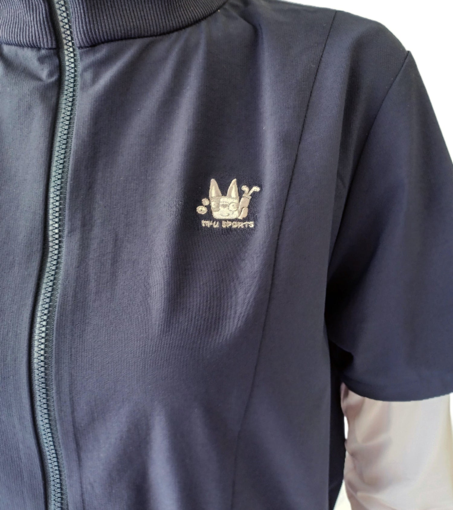 またウエスト部分の切替でツーピース、セットアップコーディネーションの様に見えすっきり感抜群。フロントファスナーを使用しており、脱ぎ着も簡単です。左胸のキャラクターのワンポイント刺繍は愛嬌のある表情でとってもキュート。