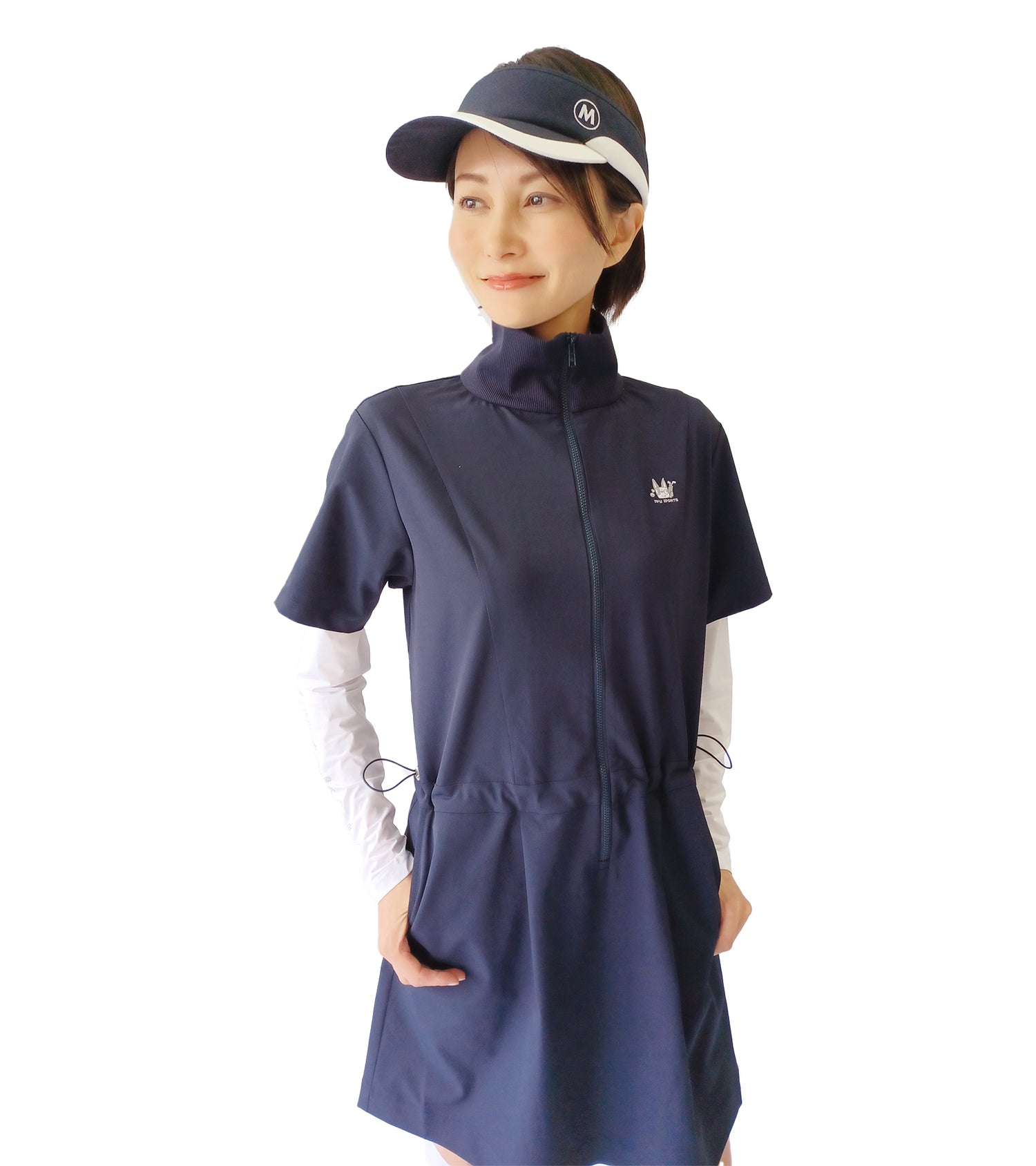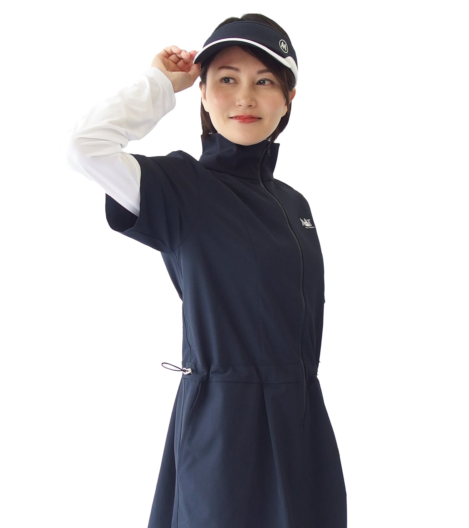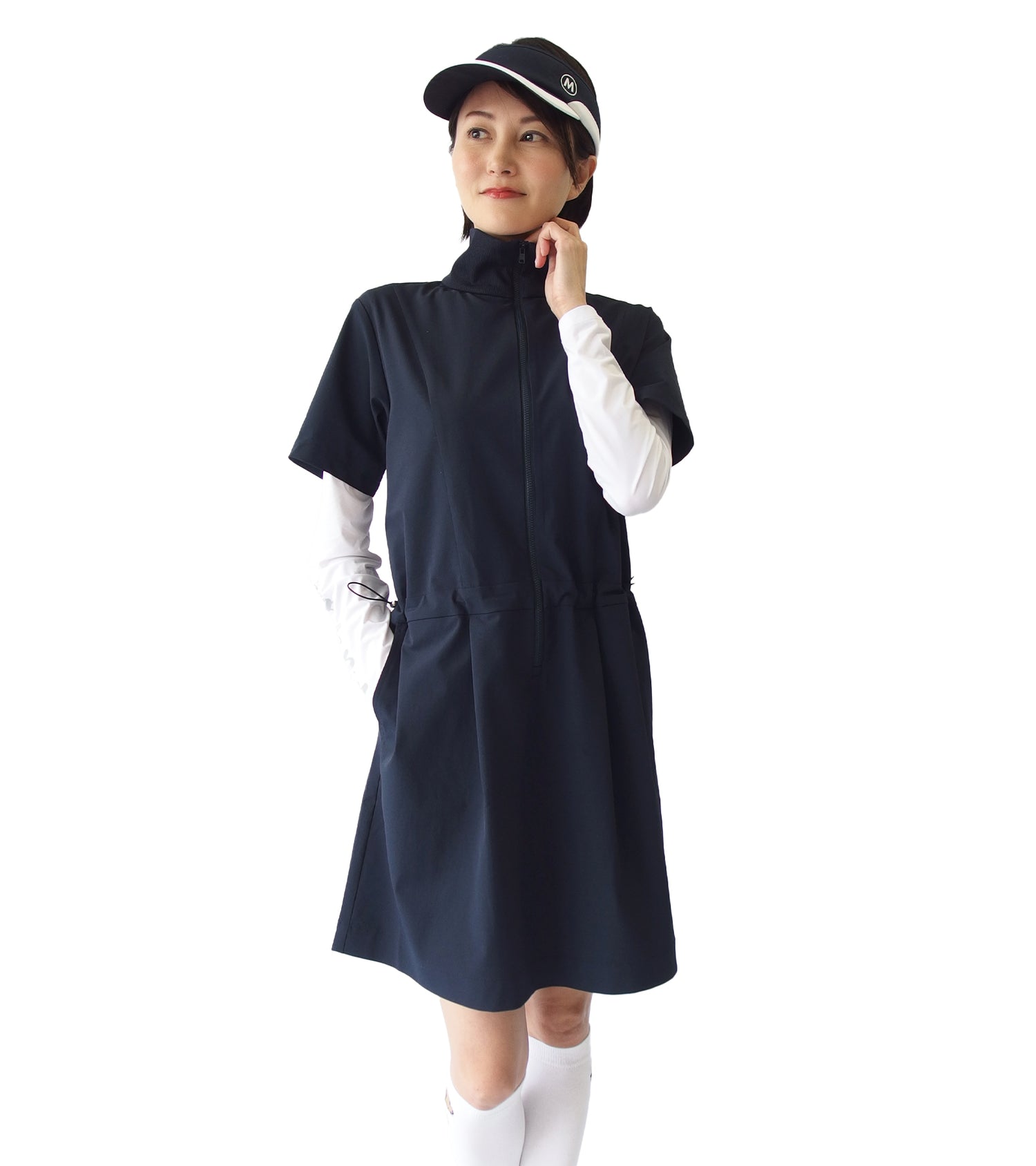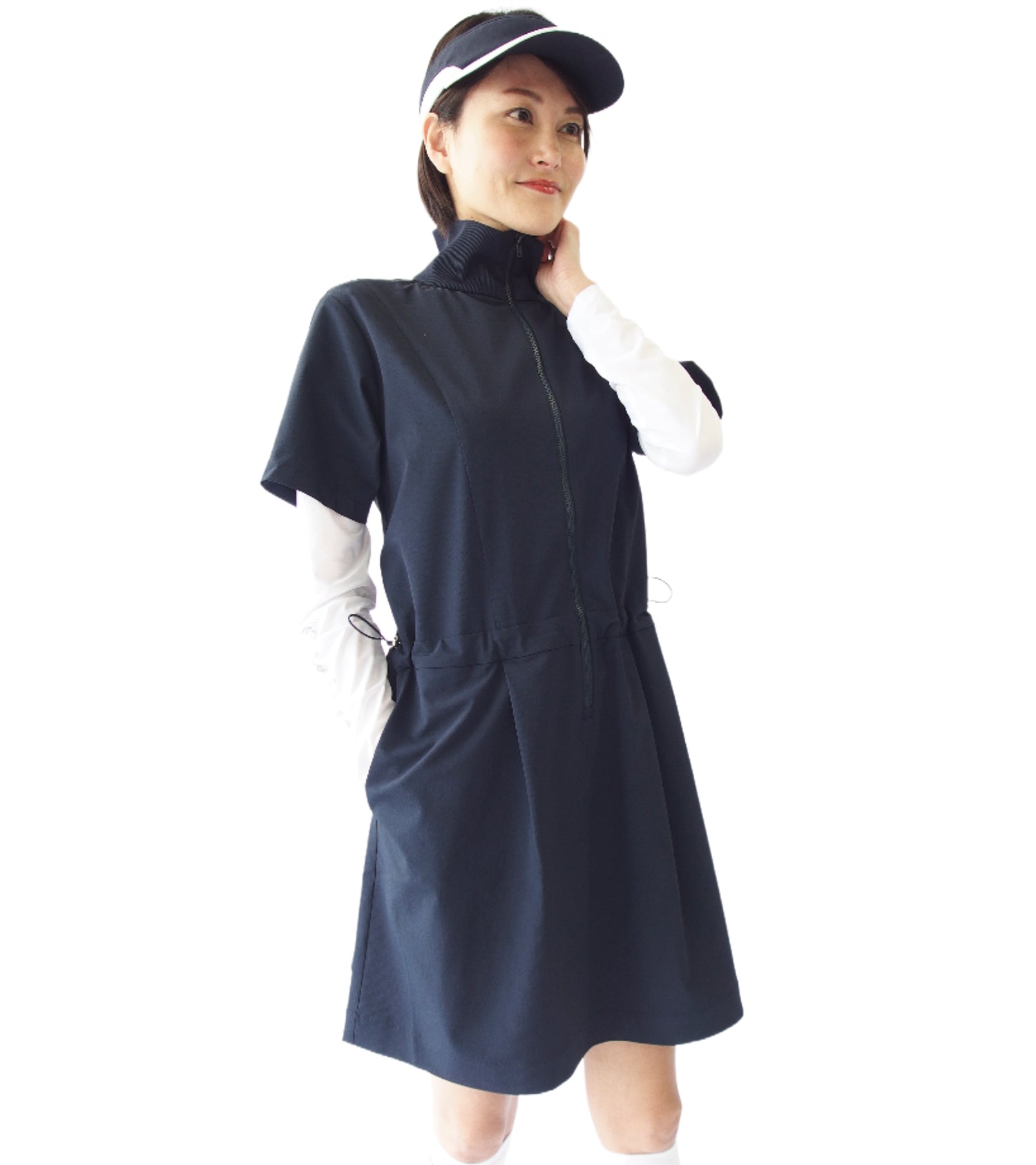 半袖スタンドリブ衿ワンピースです。ストレッチ性に富んでおり、吸水性・速乾性・UVカット機能を備えております。春先はアンダーシャツを重ね着し、レーヤールックを楽しめます。