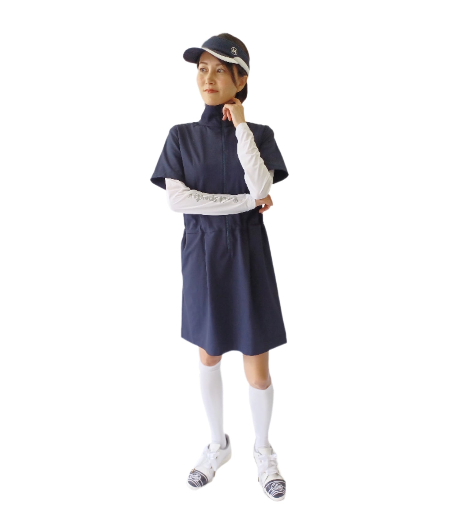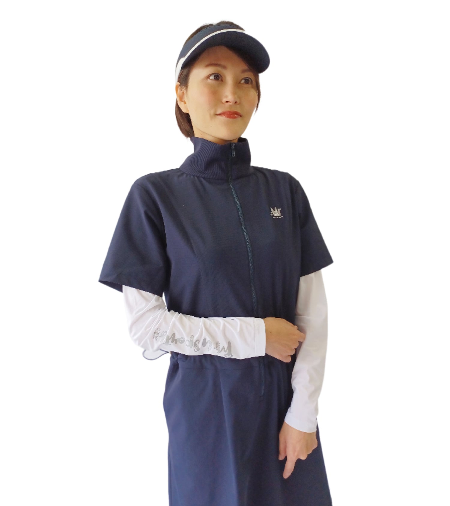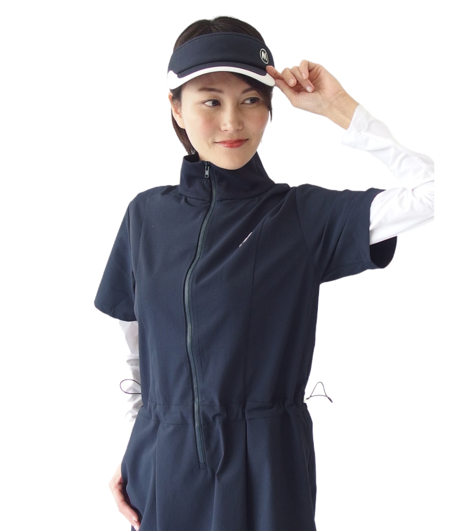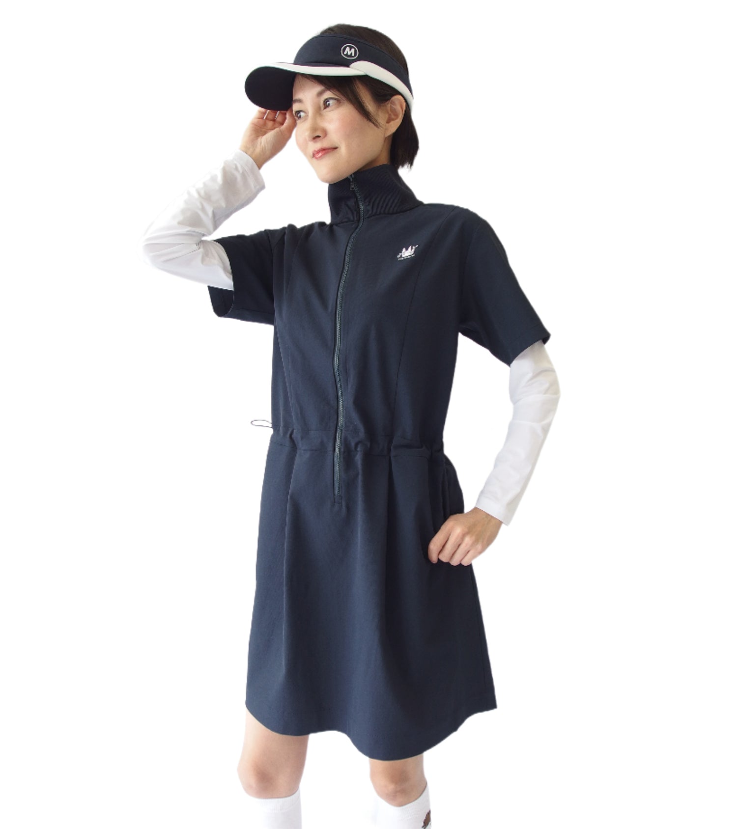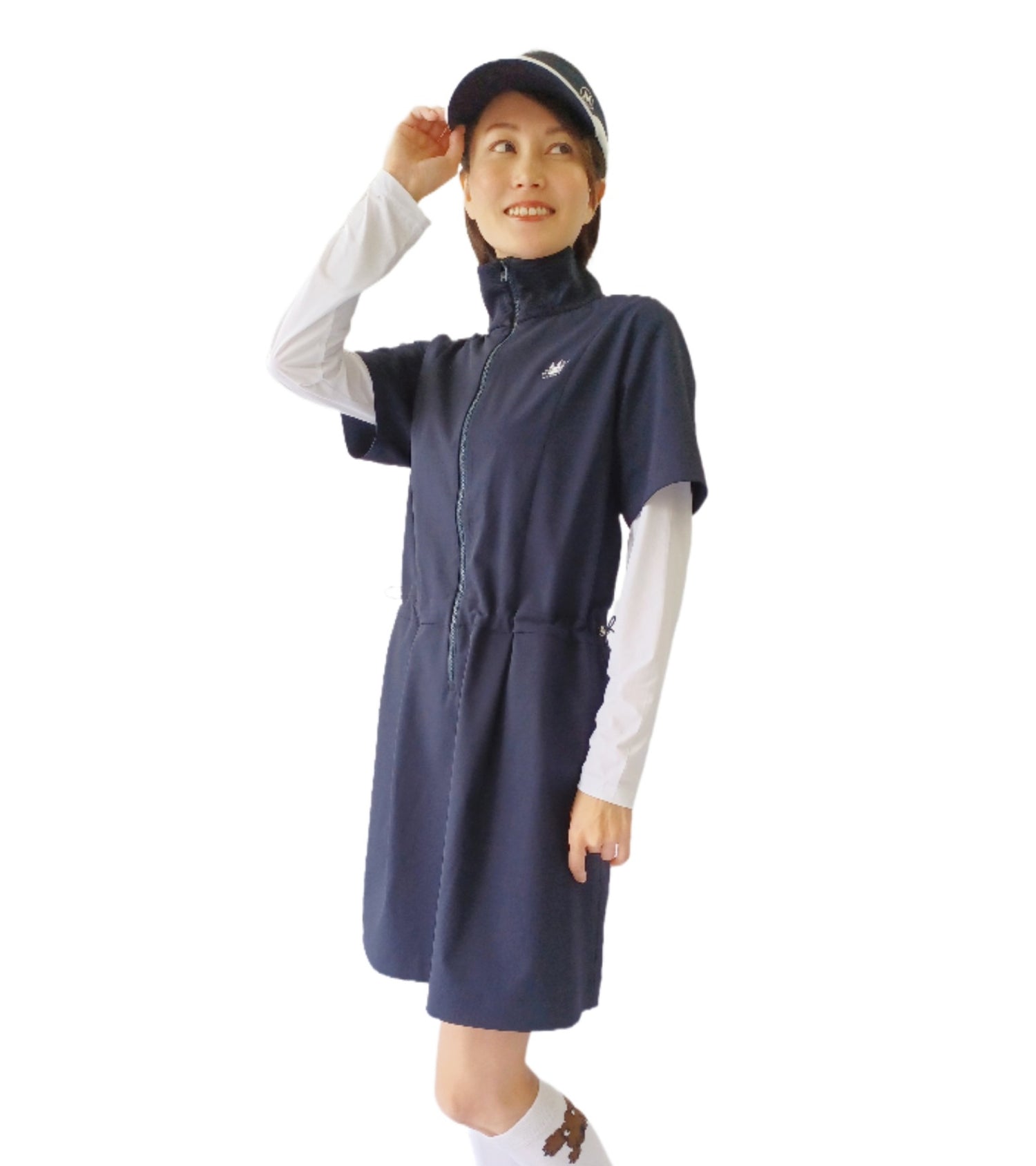 半袖スタンドリブ衿ワンピースです。ストレッチ性に富んでおり、吸水性・速乾性・UVカット機能を備えております。春先はアンダーシャツを重ね着し、レーヤールックを楽しめます。