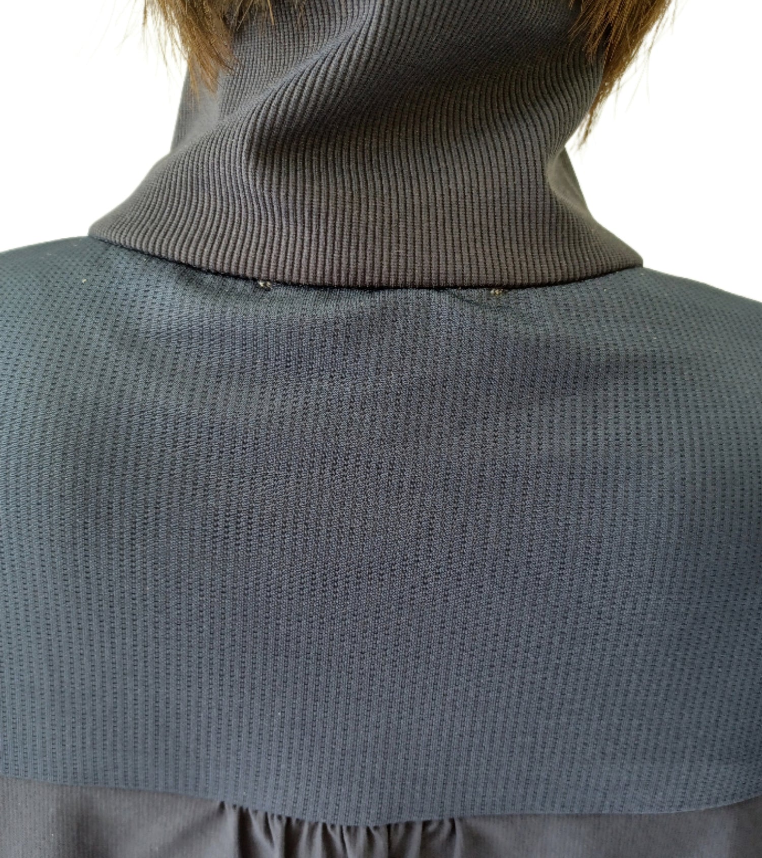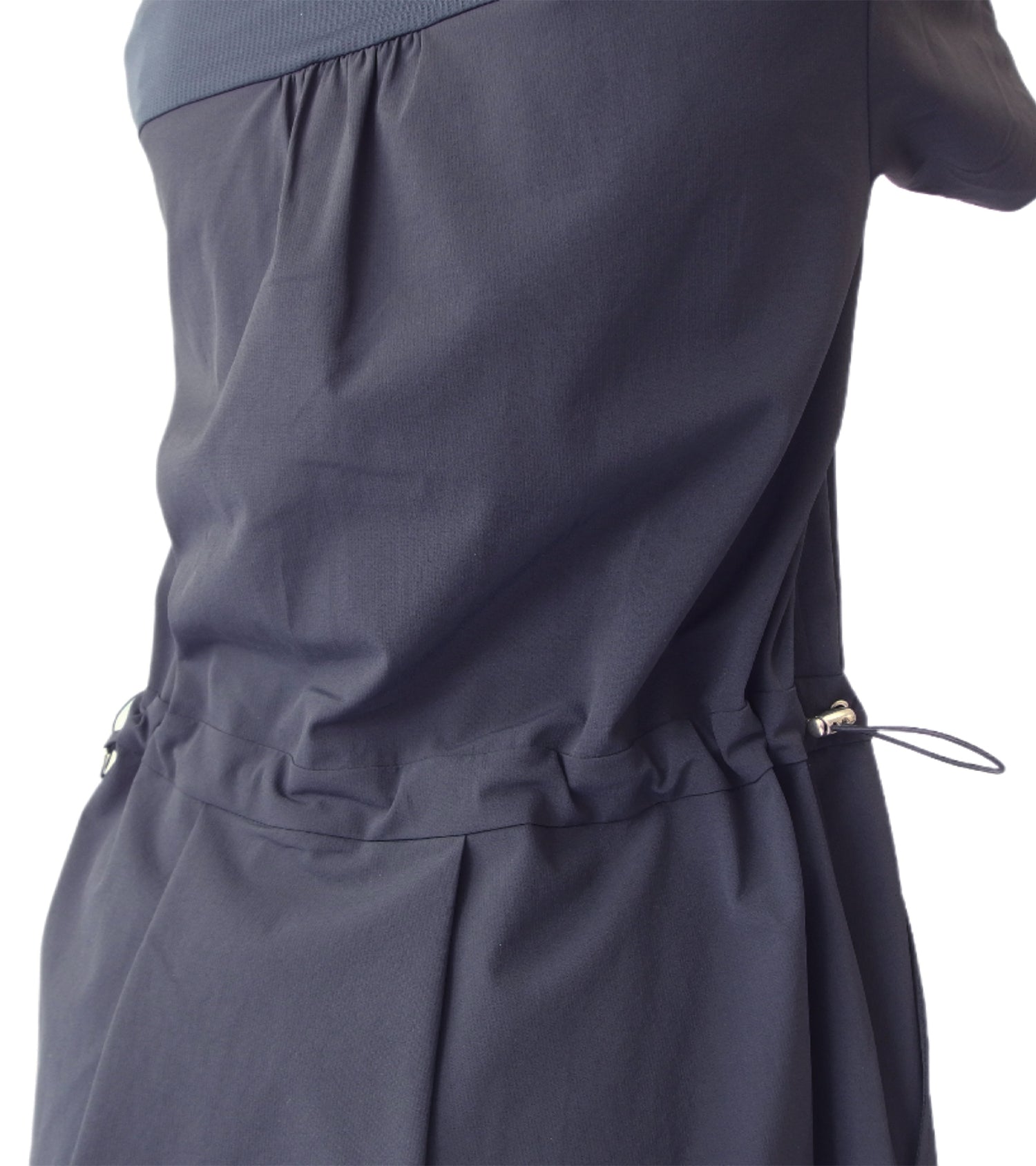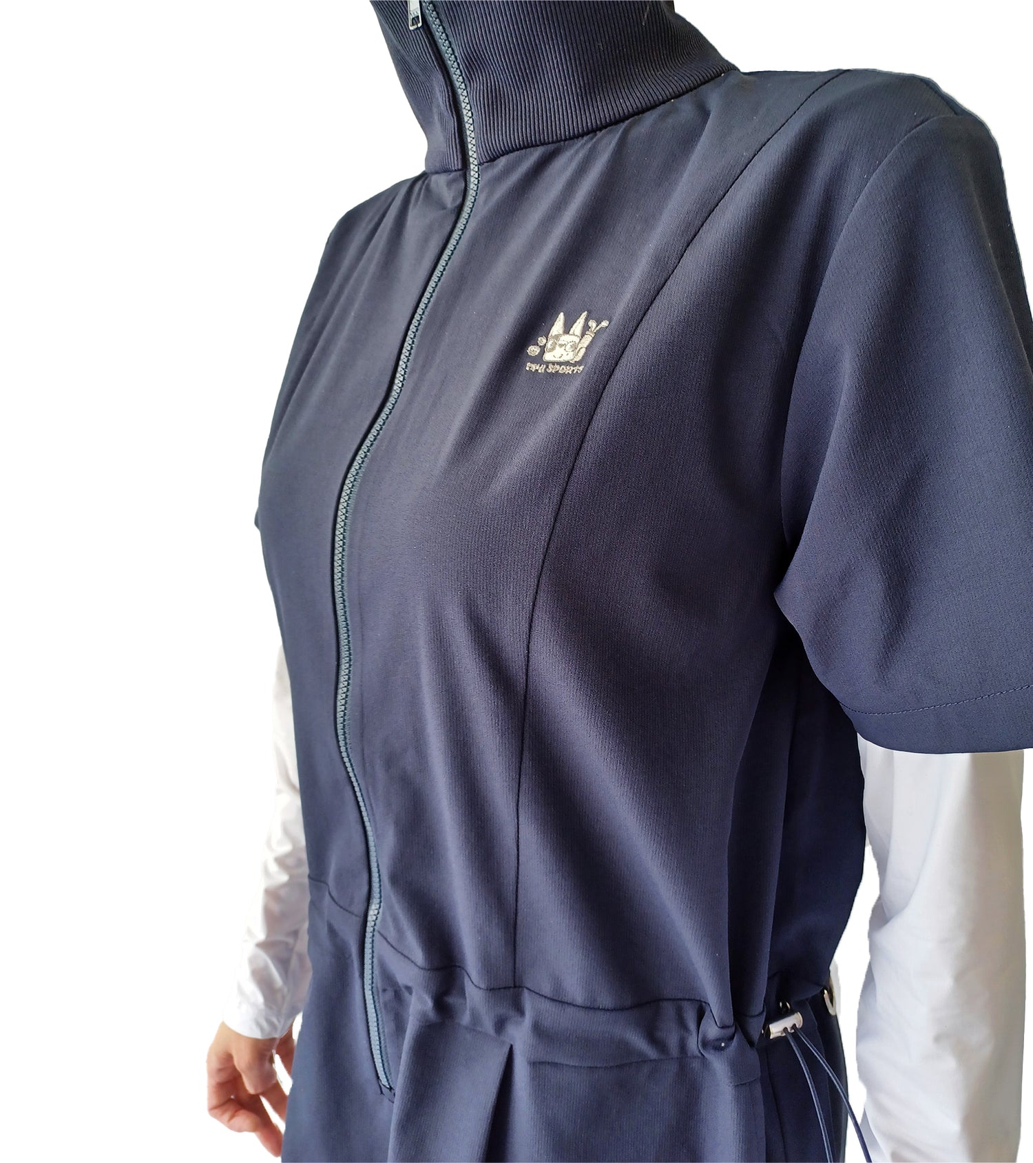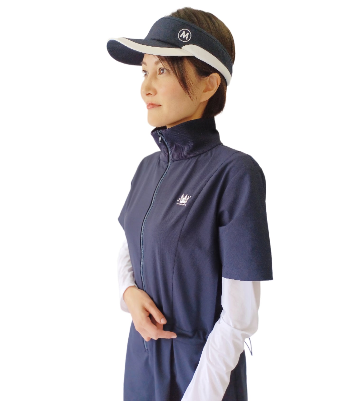 半袖スタンドリブ衿ワンピースです。ストレッチ性に富んでおり、吸水性・速乾性・UVカット機能を備えております。春先はアンダーシャツを重ね着し、レーヤールックを楽しめます。