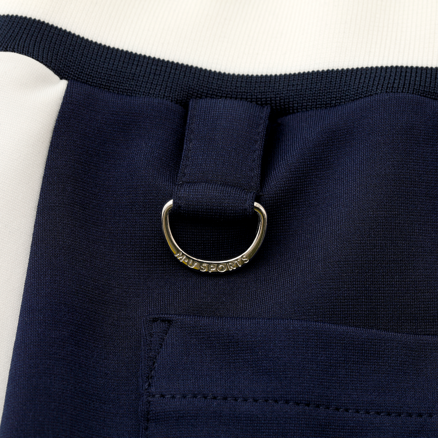 ゴルフを快適にプレイする為に後ろ右ポケットに入れるスコアーカードの出し入れに邪魔にならない様に、またスイングした際にボールポーチが邪魔にならない様にDカン位置は考えられ左後ろに付けられています。