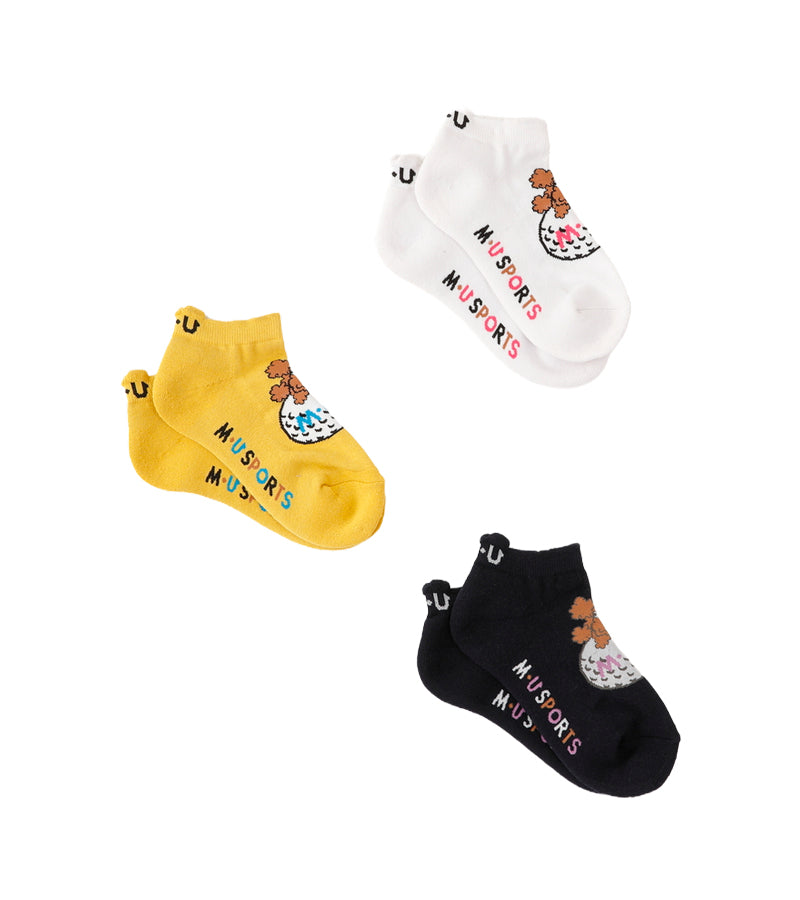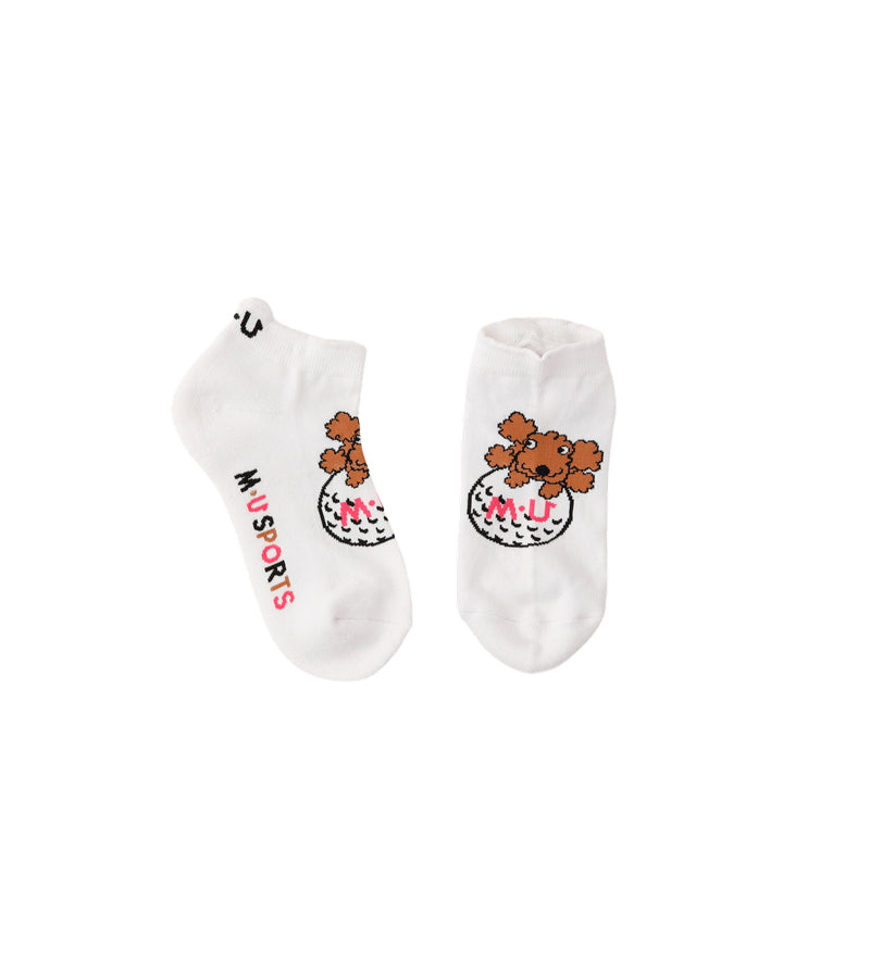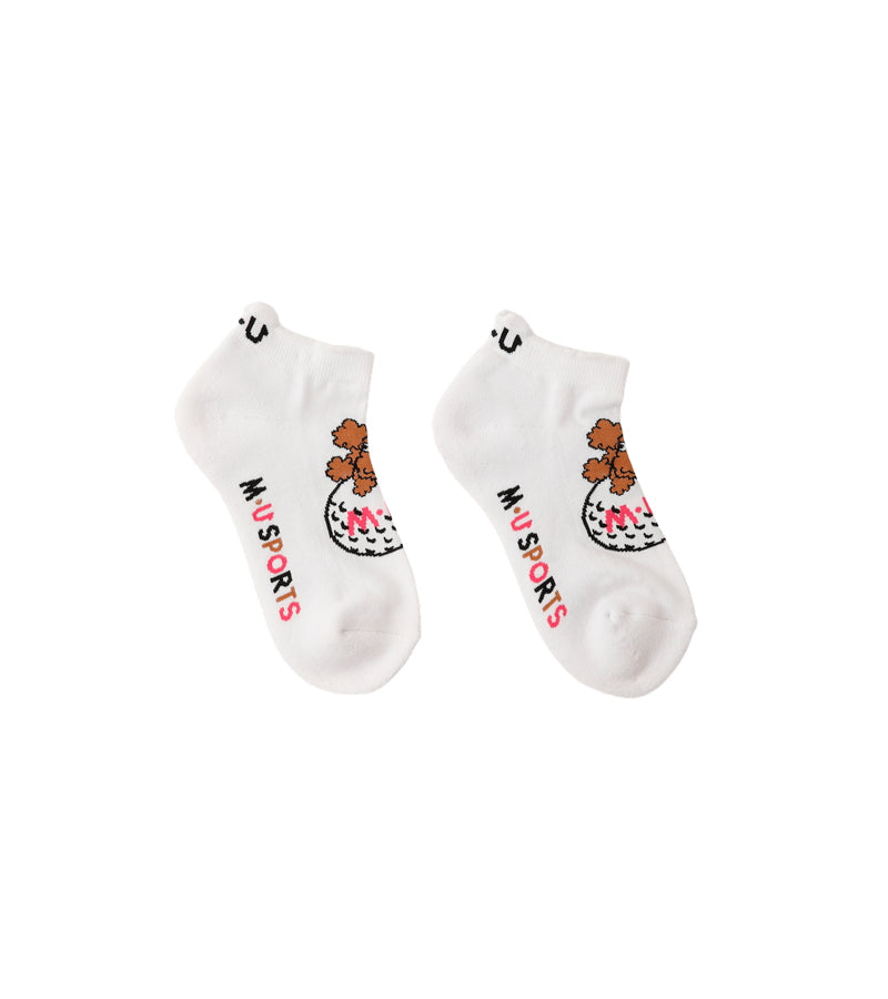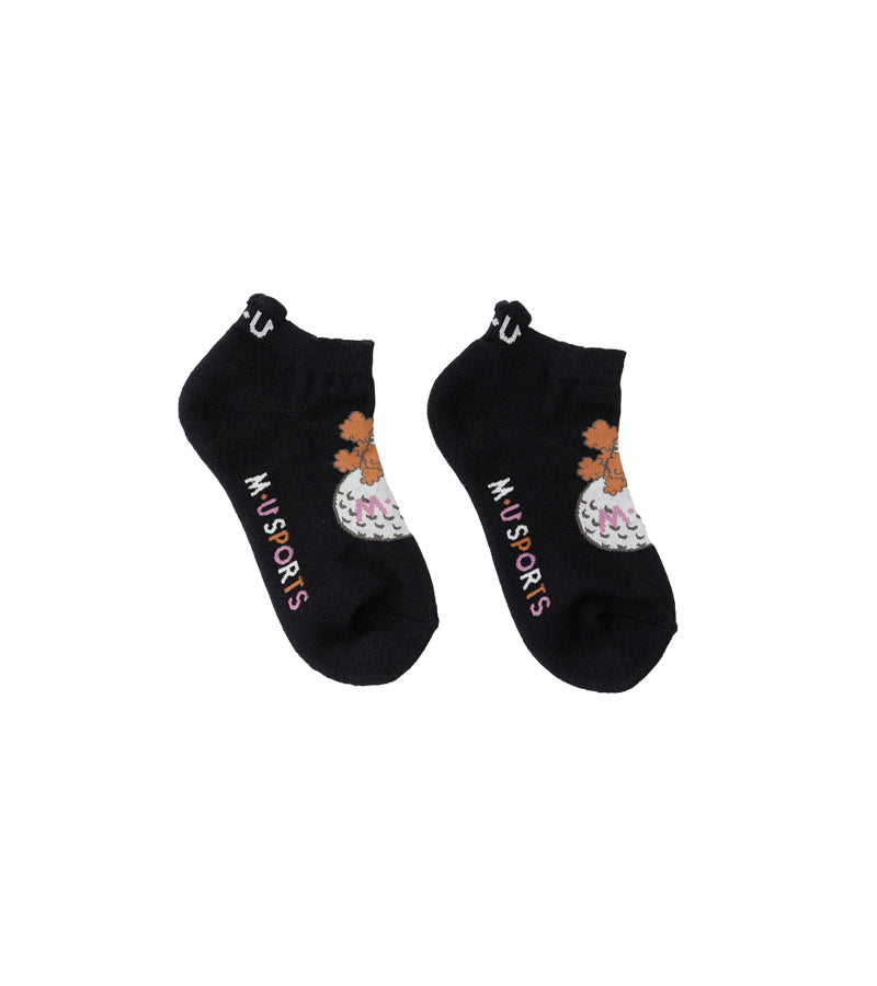 足口バックにMUロゴ。足の甲部分にゴルフボールに乗ったシュシュが描かれています。