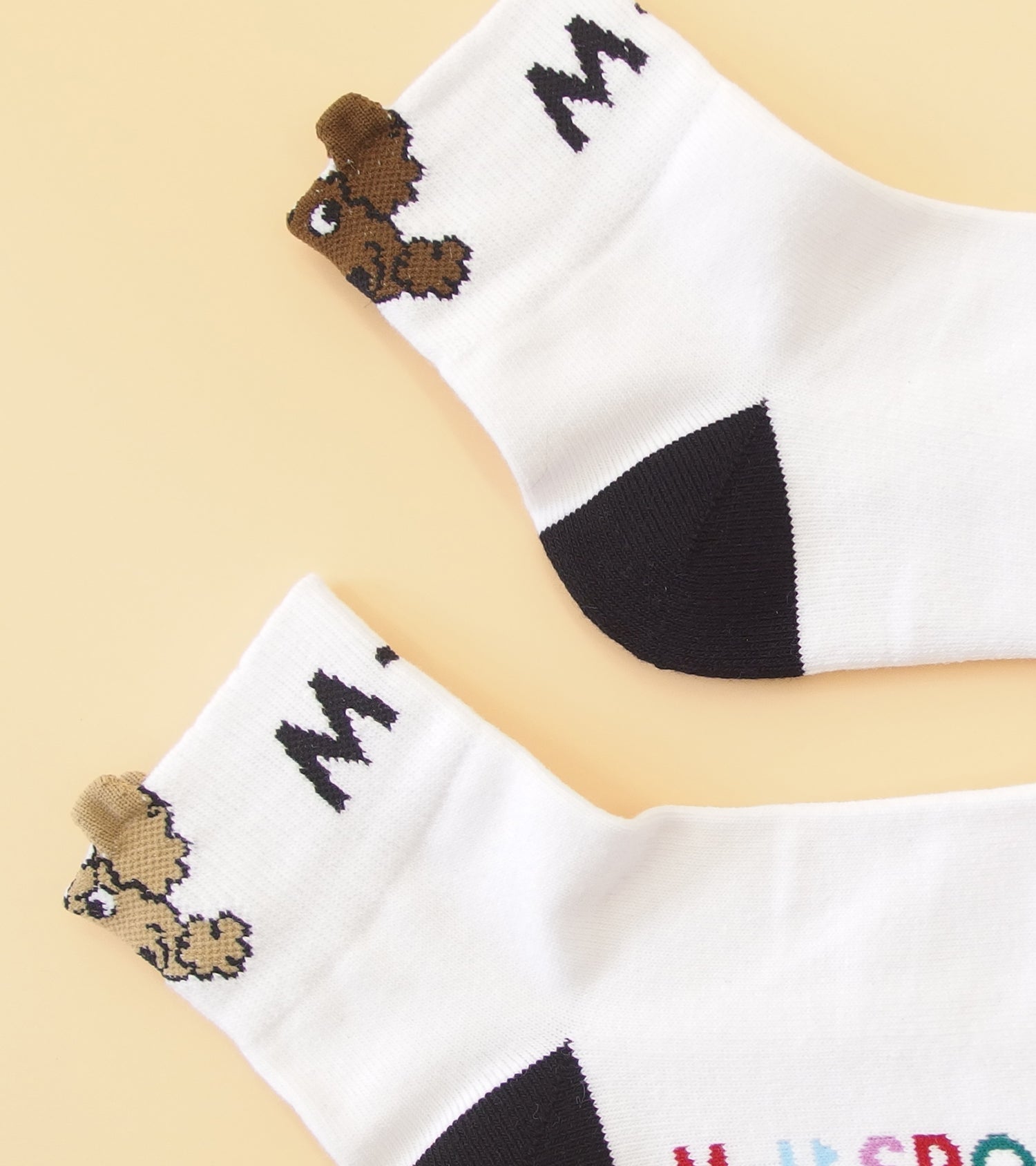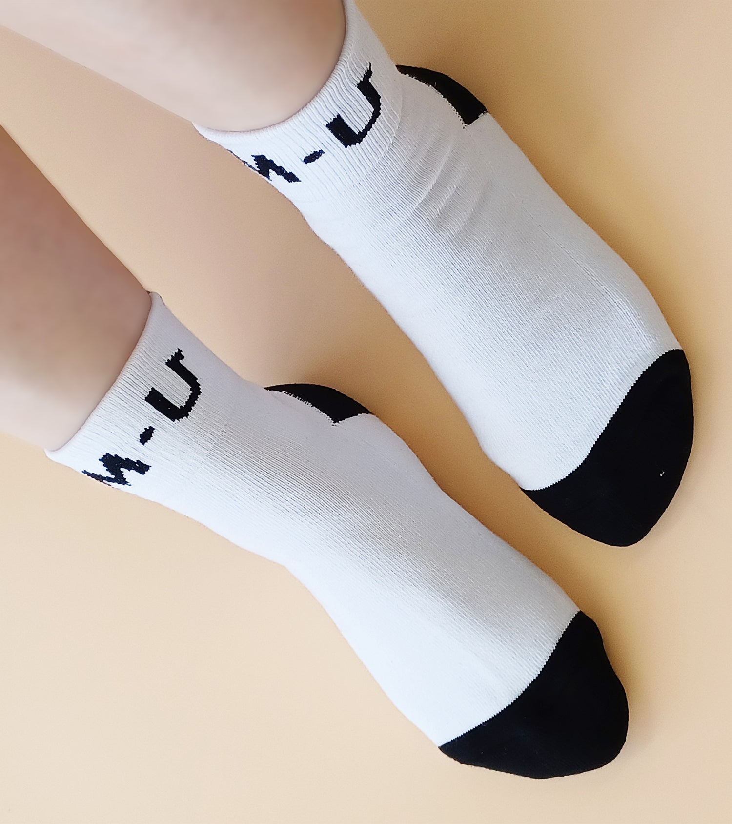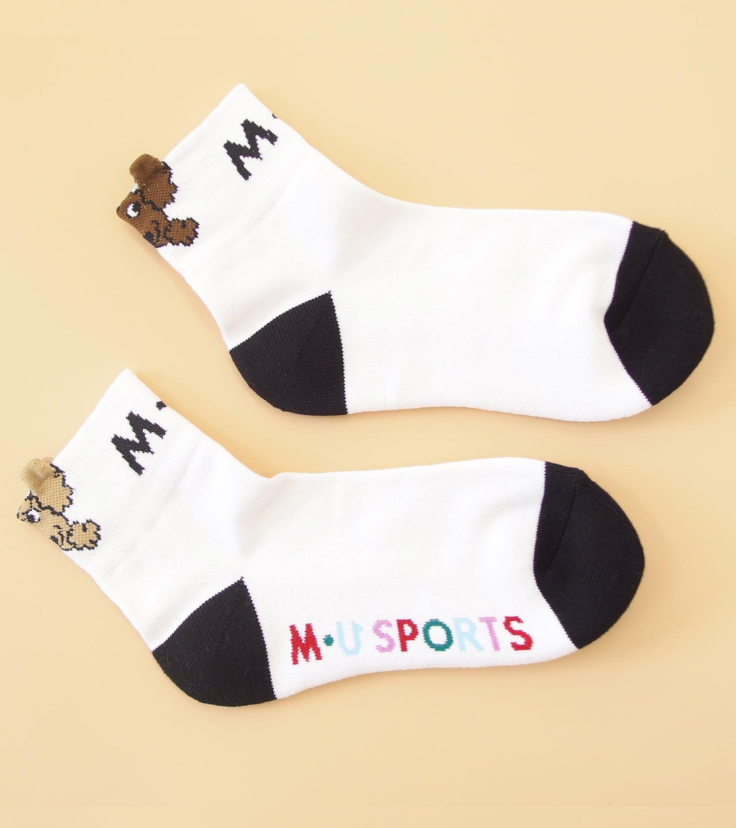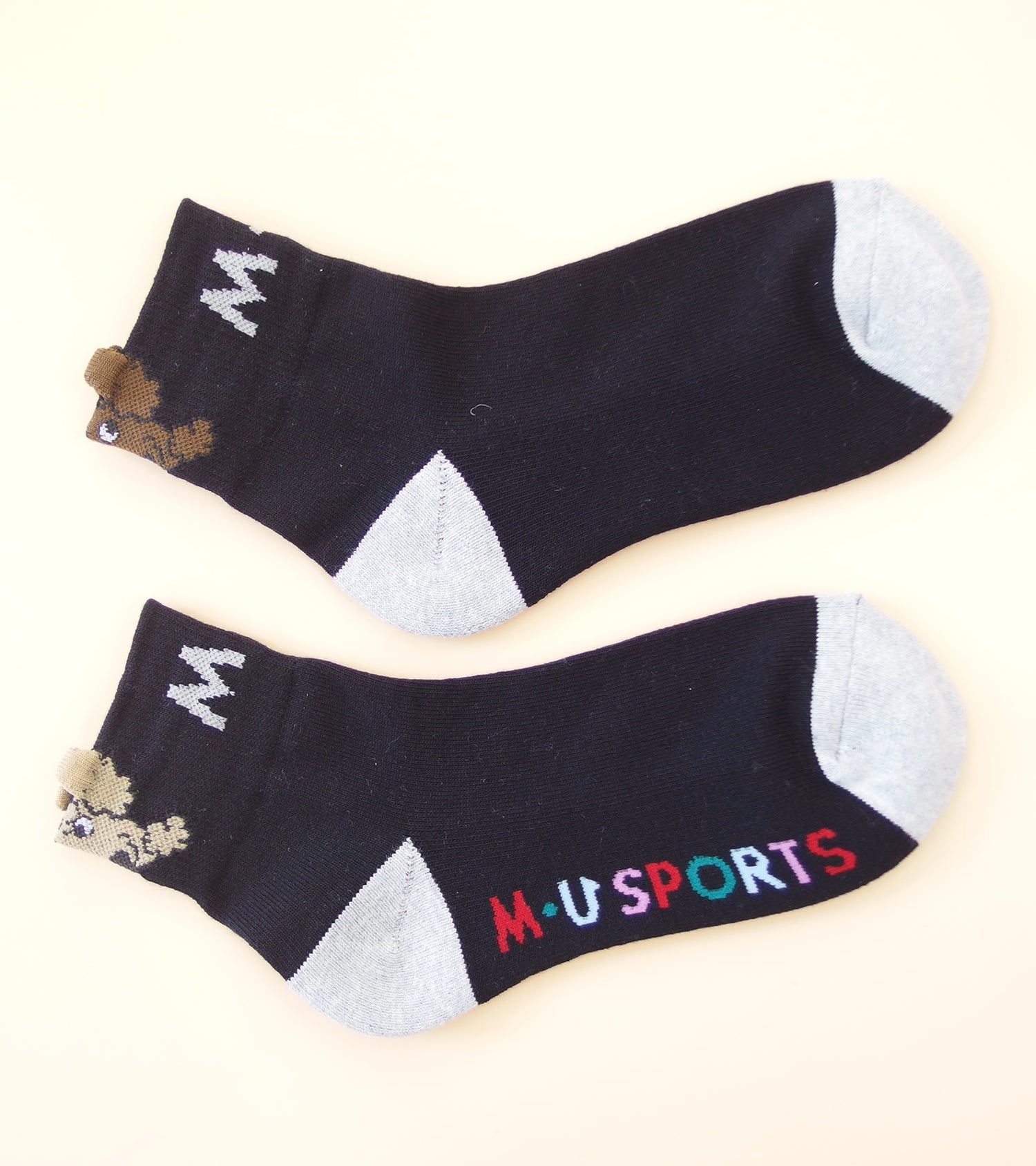 スタイリッシュなショートソックス、黒と白のカラーは2色。足の甲にはロゴ、かかとに描かれた可愛いキャラクターのシュシュのモチーフがアクセントです。