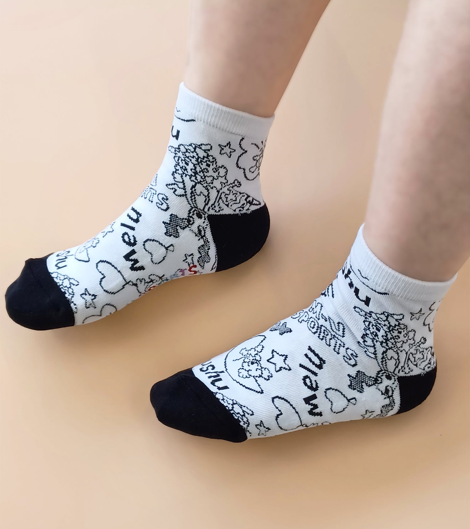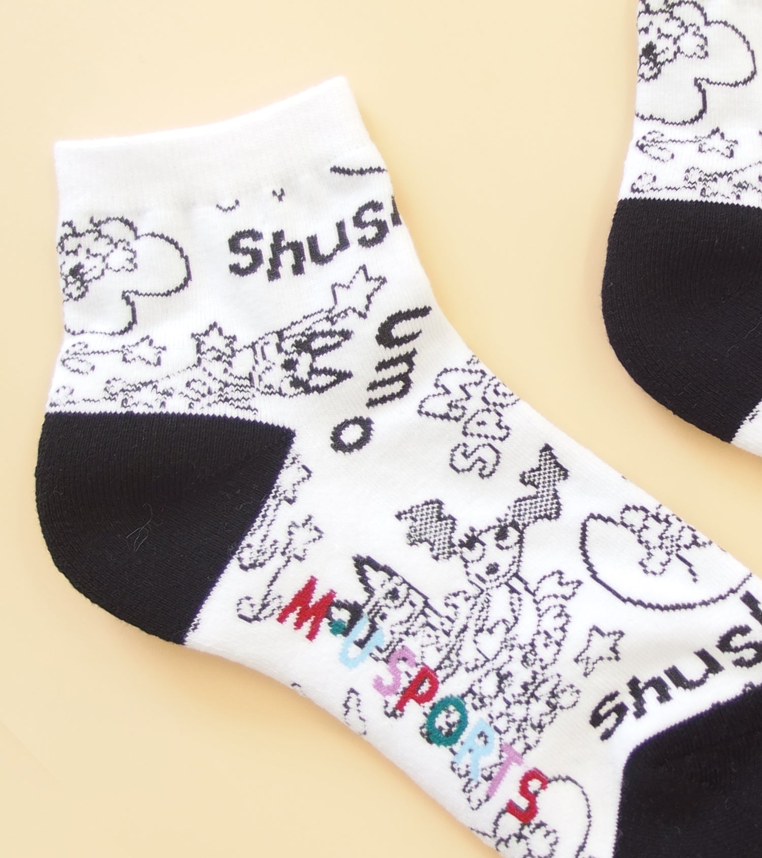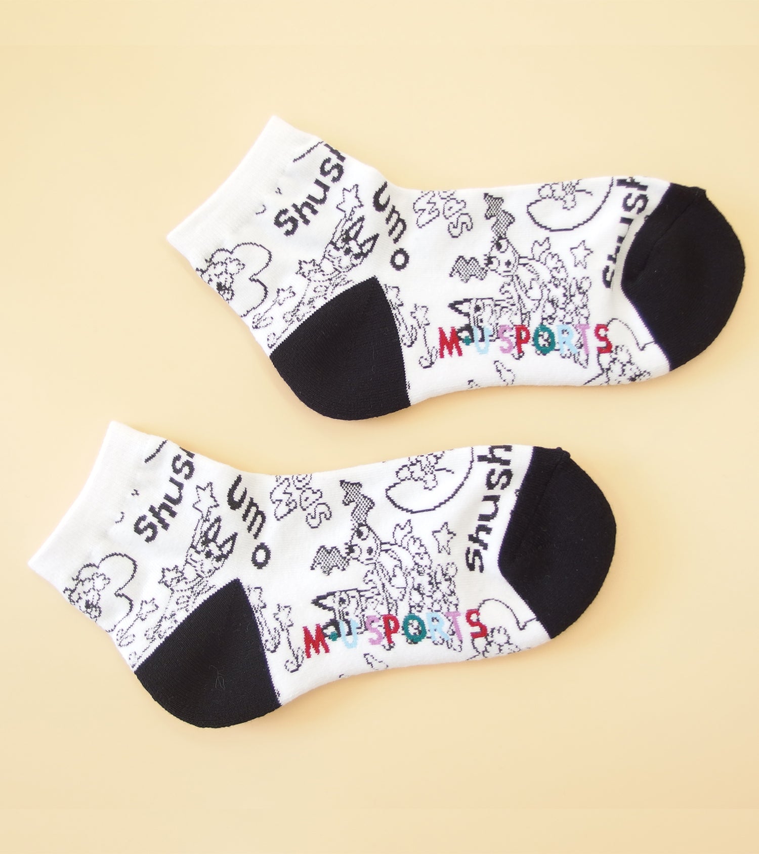MUらしいポップな総柄が魅力のショートソックス。シンプルなコーデにも映えるデザインで、足元に遊び心をプラスします。