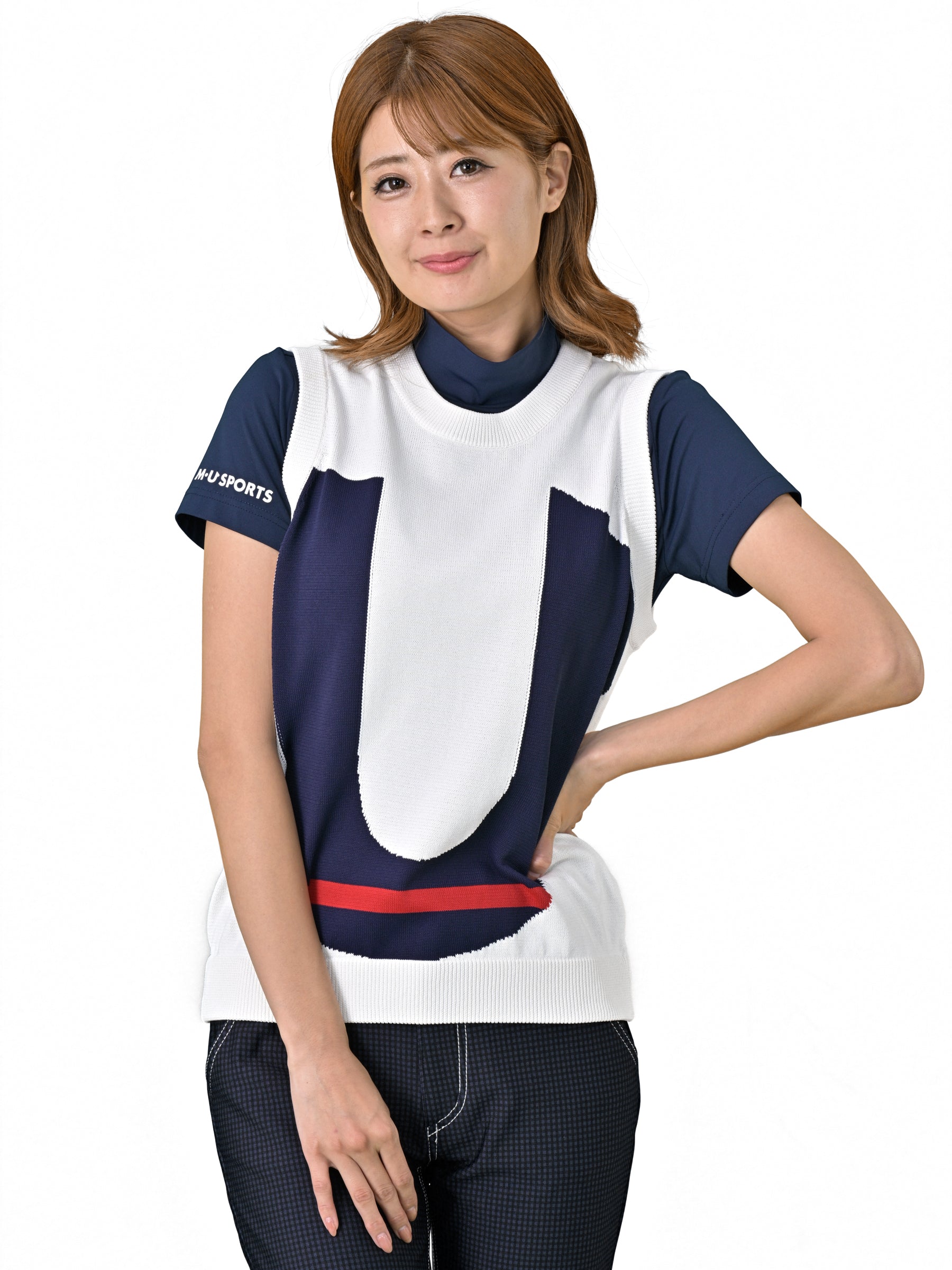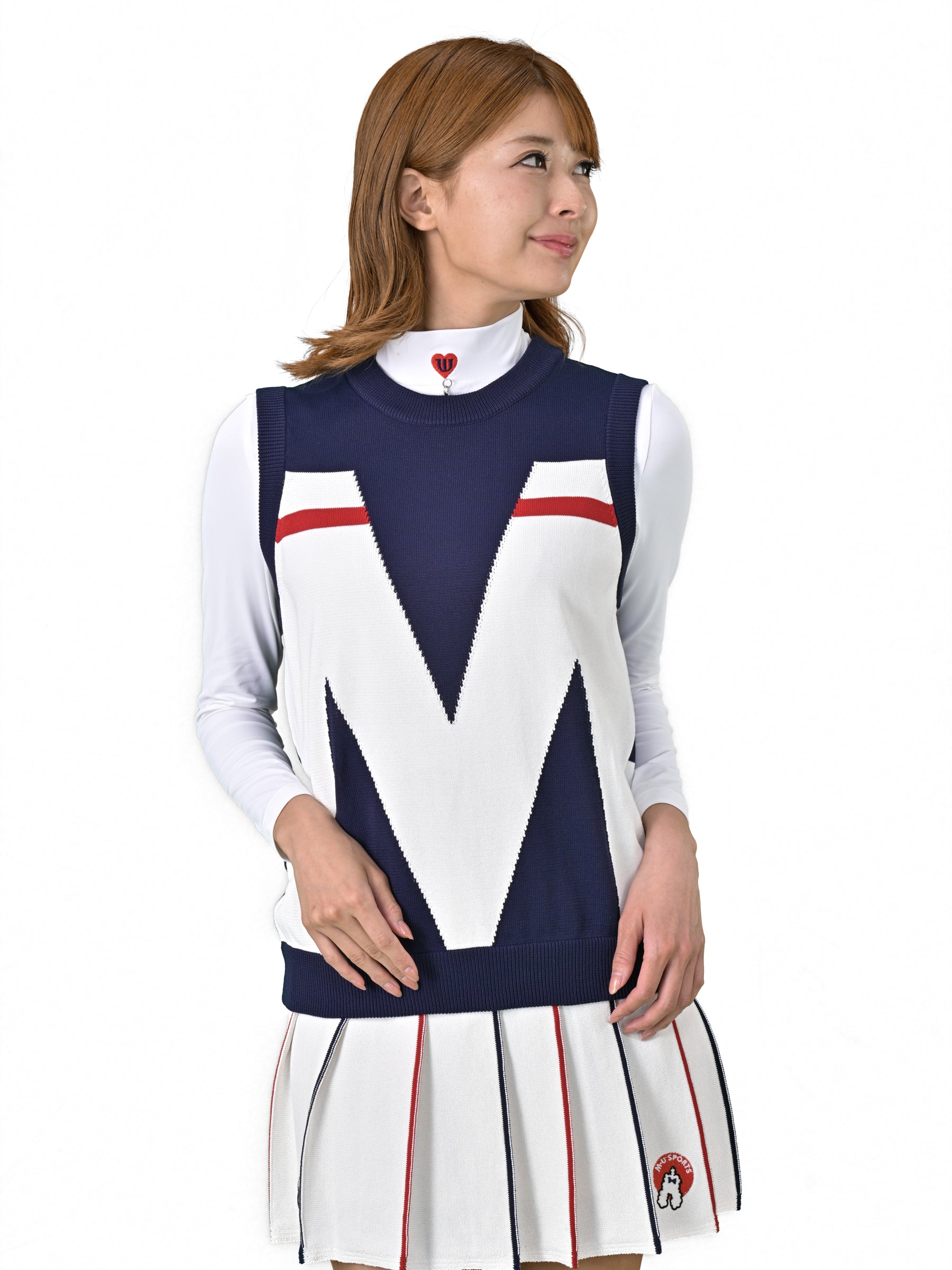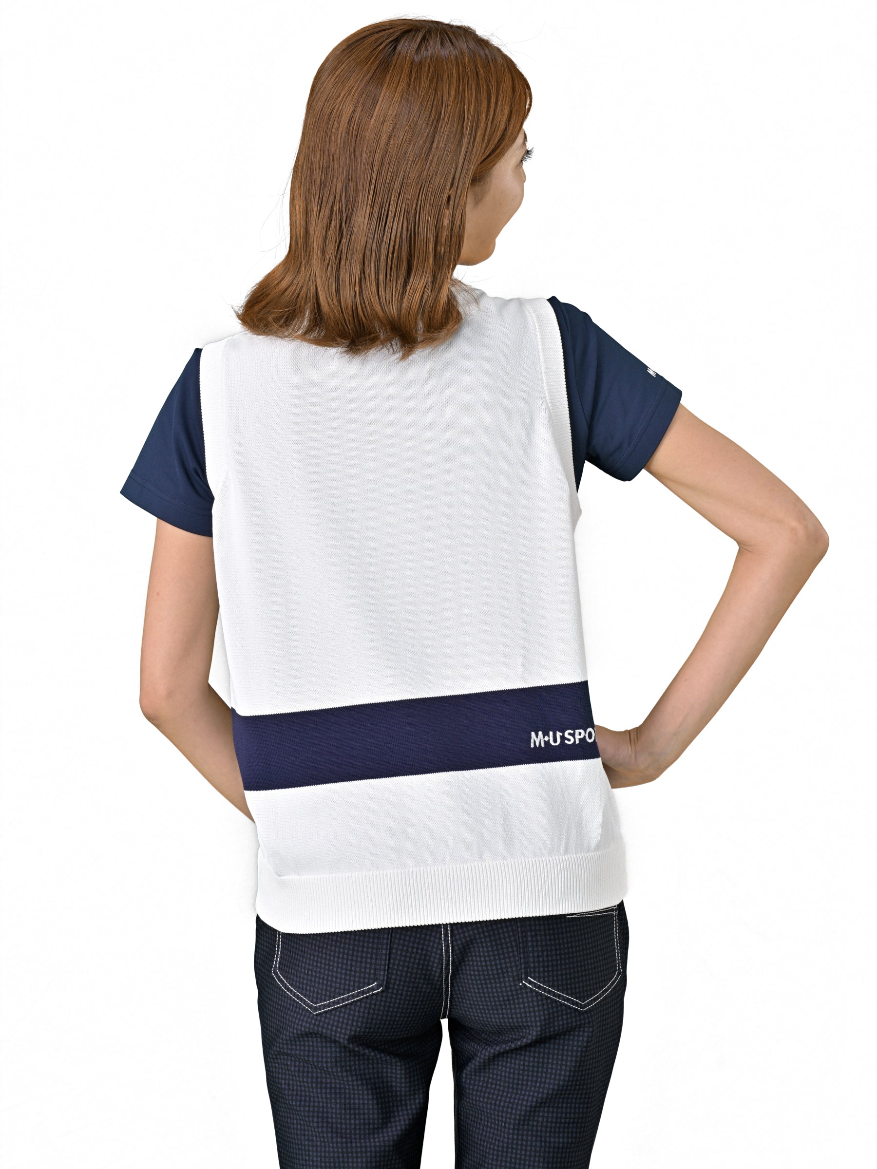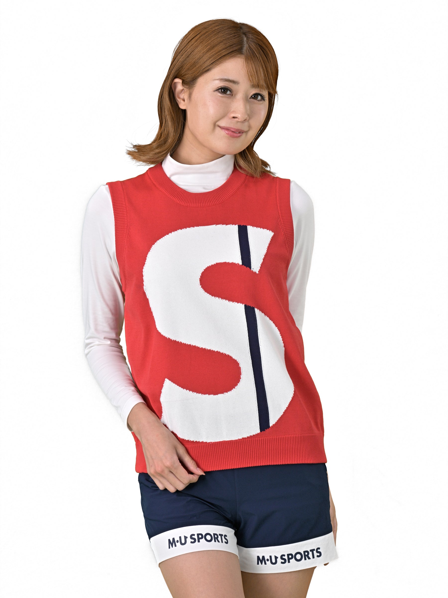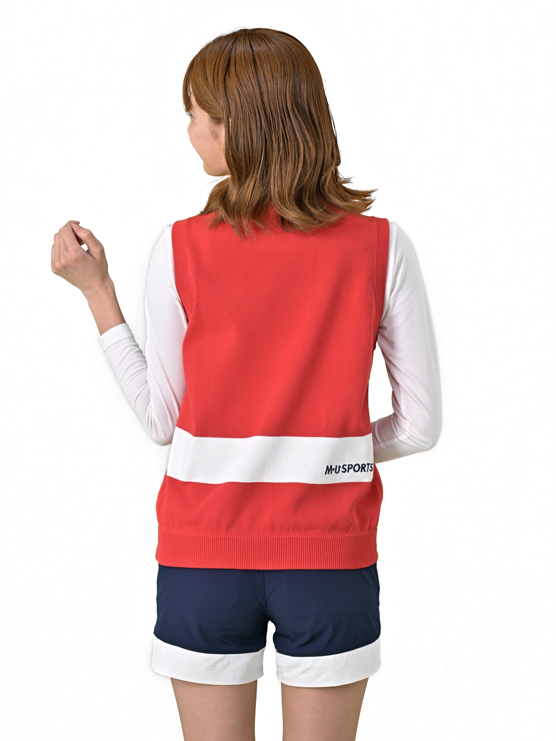 まるでコットンの様なタッチの特殊なポリエルテル糸を使用した大胆ロゴインターシャベスト。
