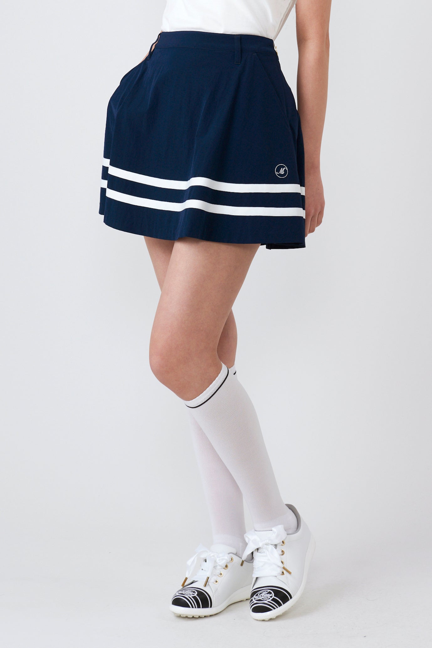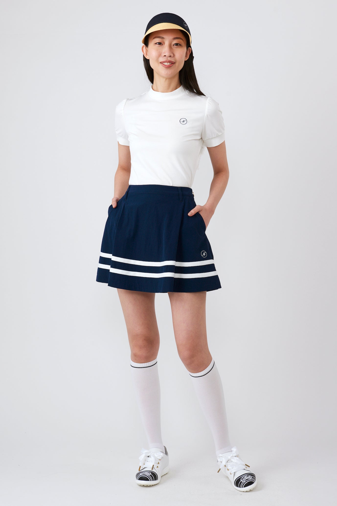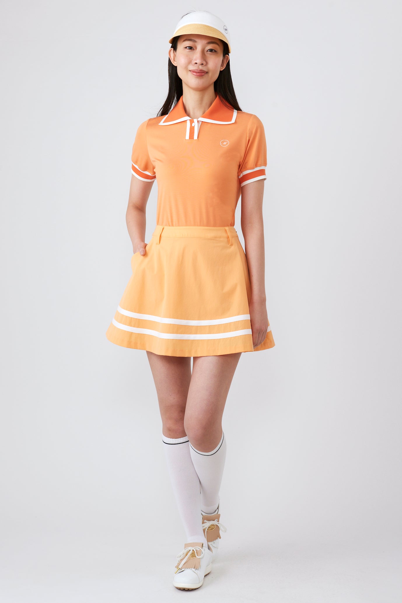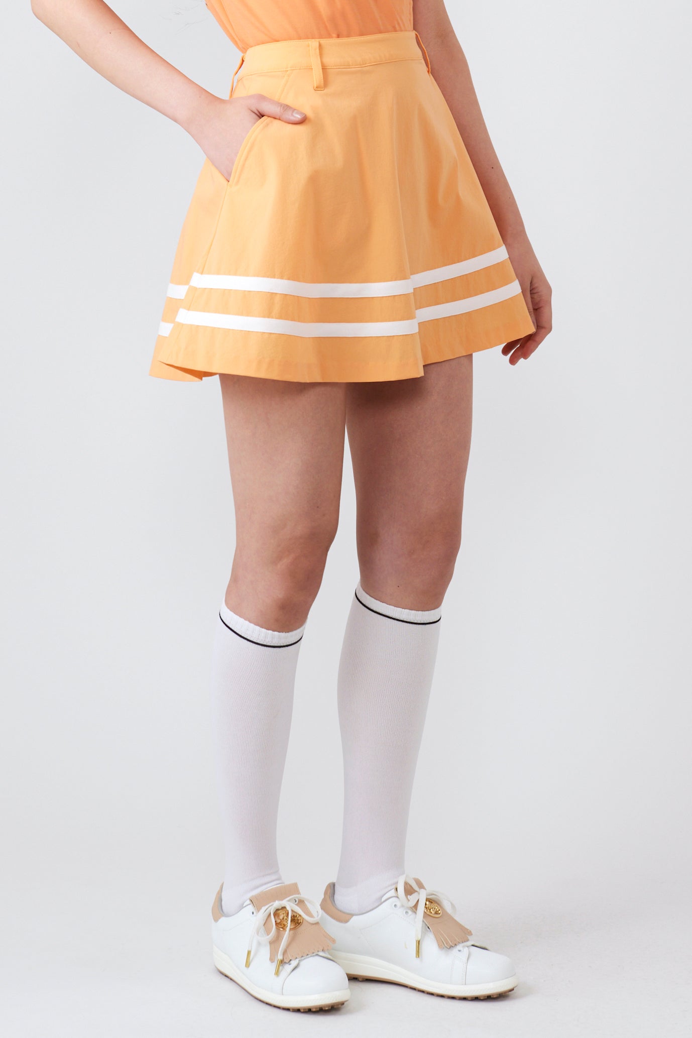 This sophisticated flared skirt features a line design around the hem that tightens the overall look. The beautiful drape that appears with every step creates a soft and elegant feminine look. At the same time, the line at the hem adds a sporty accent, creating an exquisite balance that is not too sweet and perfect for mature golf wear .