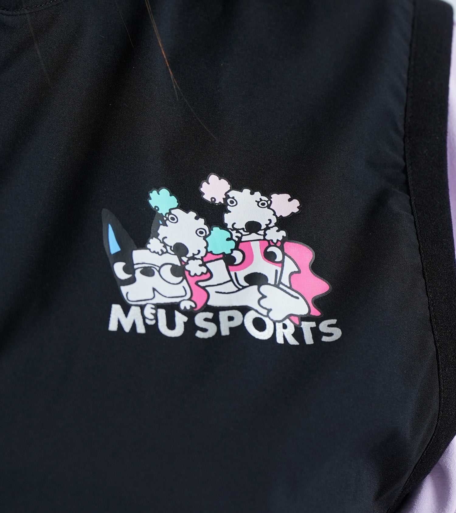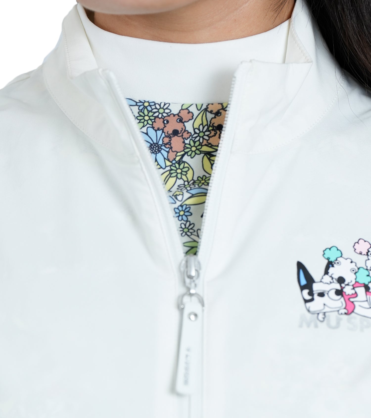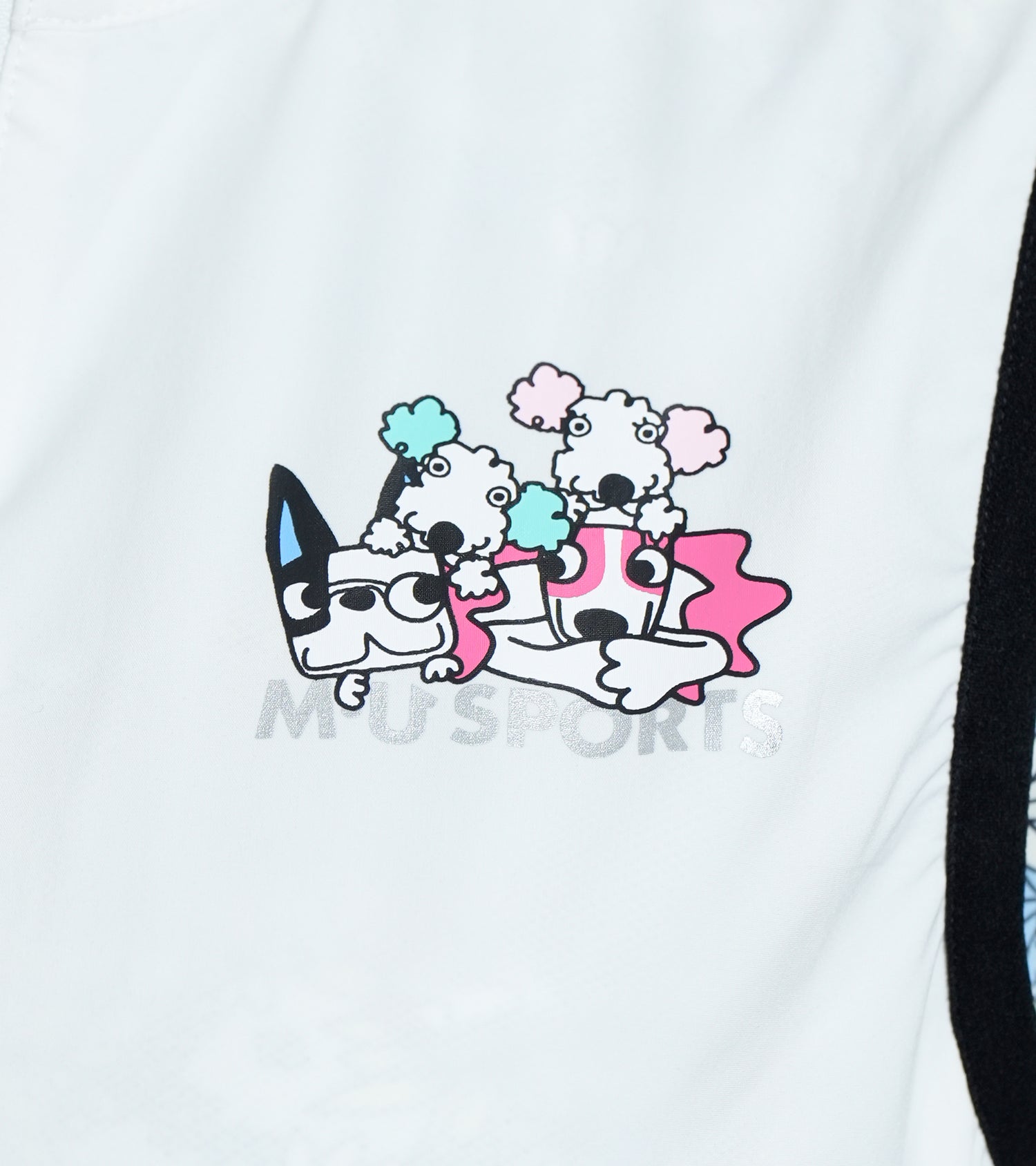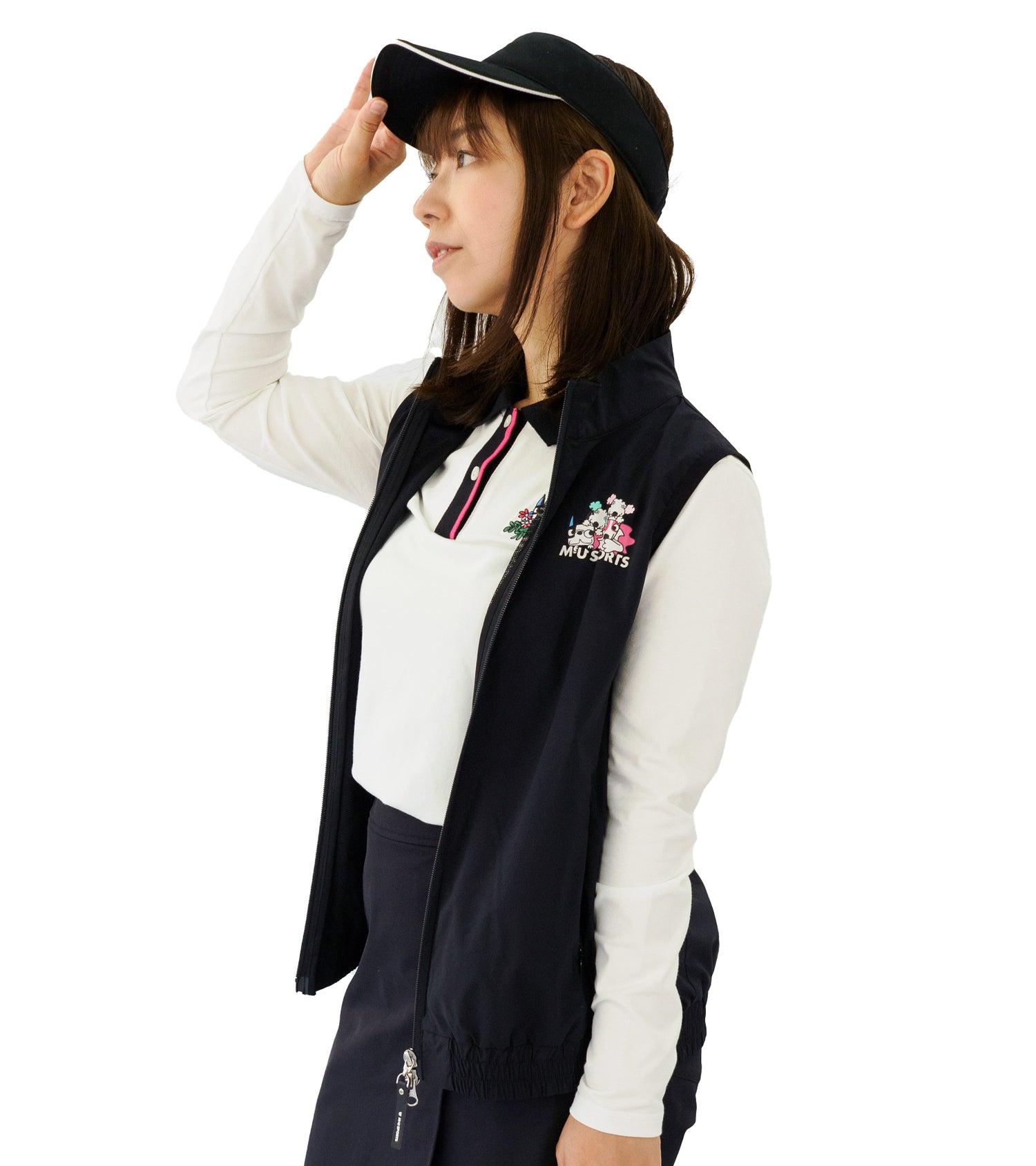 4WAYストレッチ。着用感の良いアウターベストです。すっきりコンパクトな丈で、9分丈パンツ・ストレートパンツにも合い、コーディネートしやすい1枚は持っていたいアイテムです。左胸にはキャラクター全員集合のカラフルプリントをし可愛く表現しています。撥水UVカット機能付き!