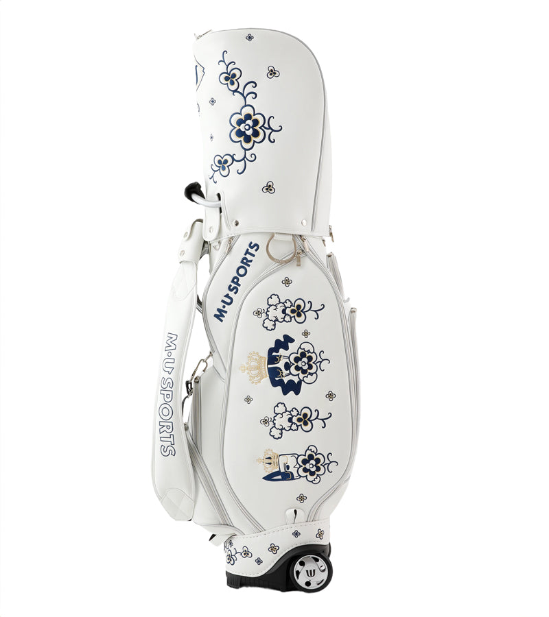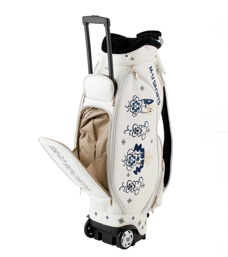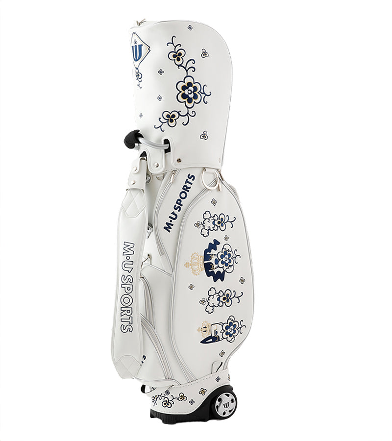 凹凸感のあるエンボス加工された高級感漂うソフトなポリウレタン素材を使用した9型ローリングソールのキャディバック。