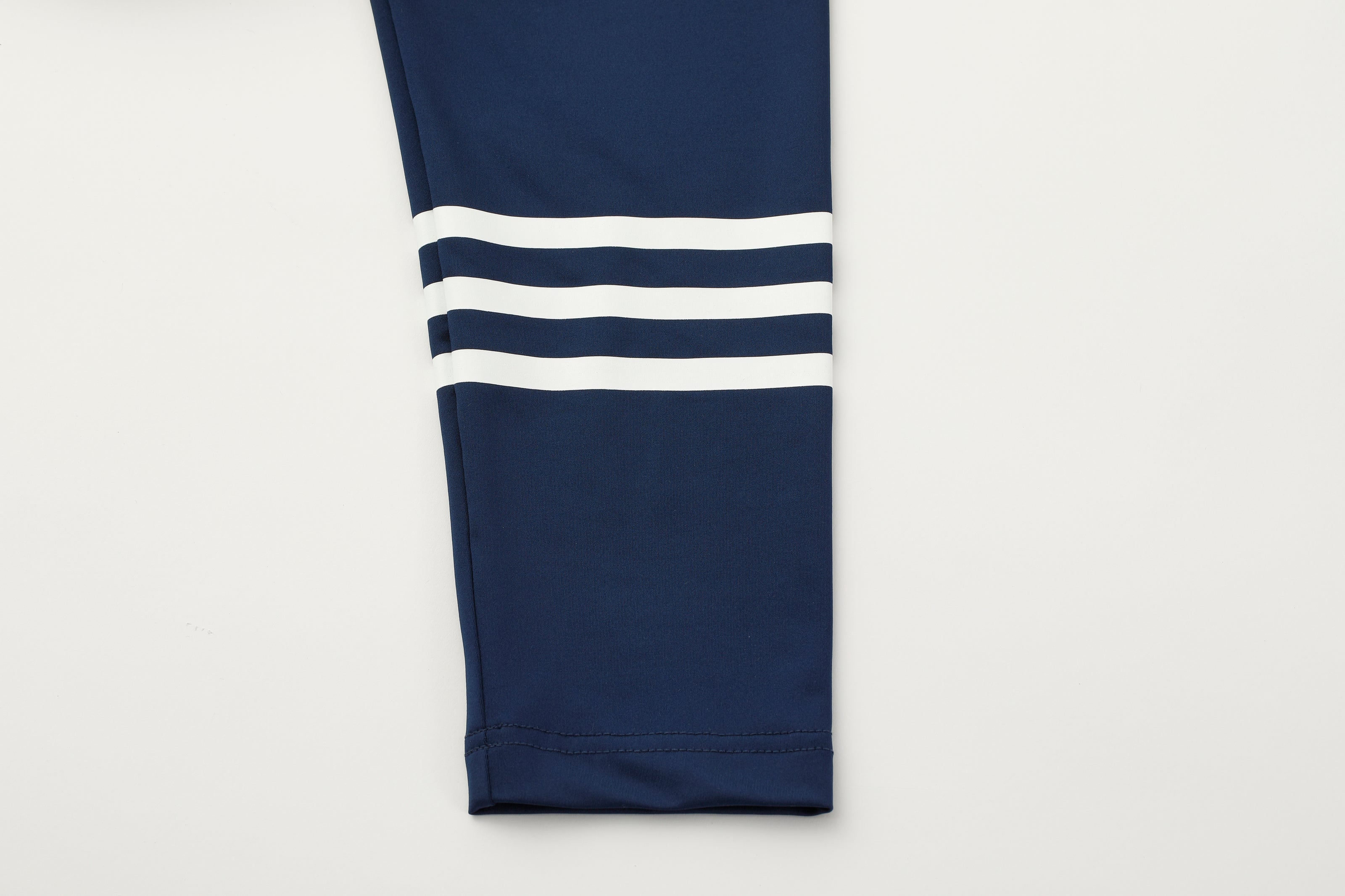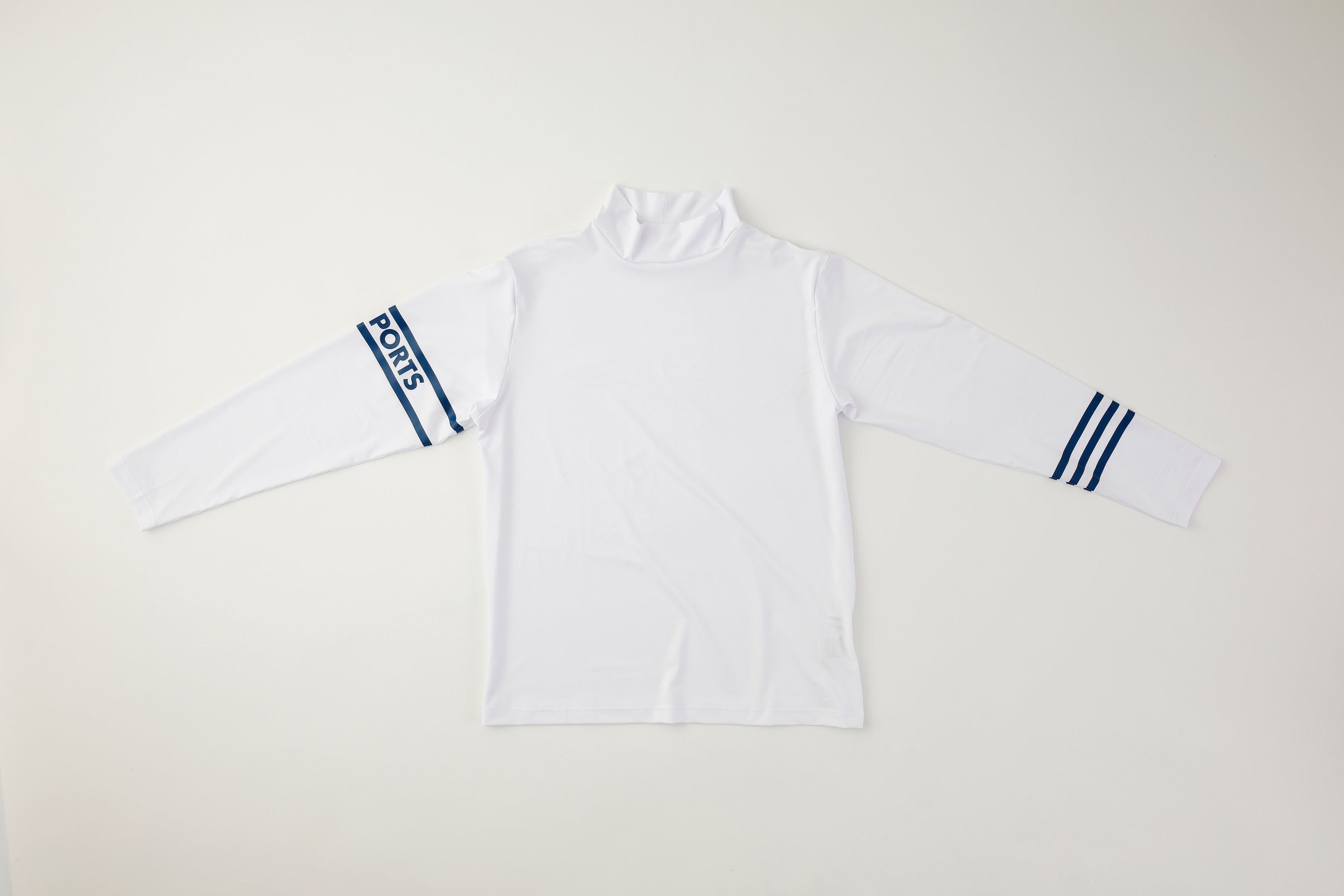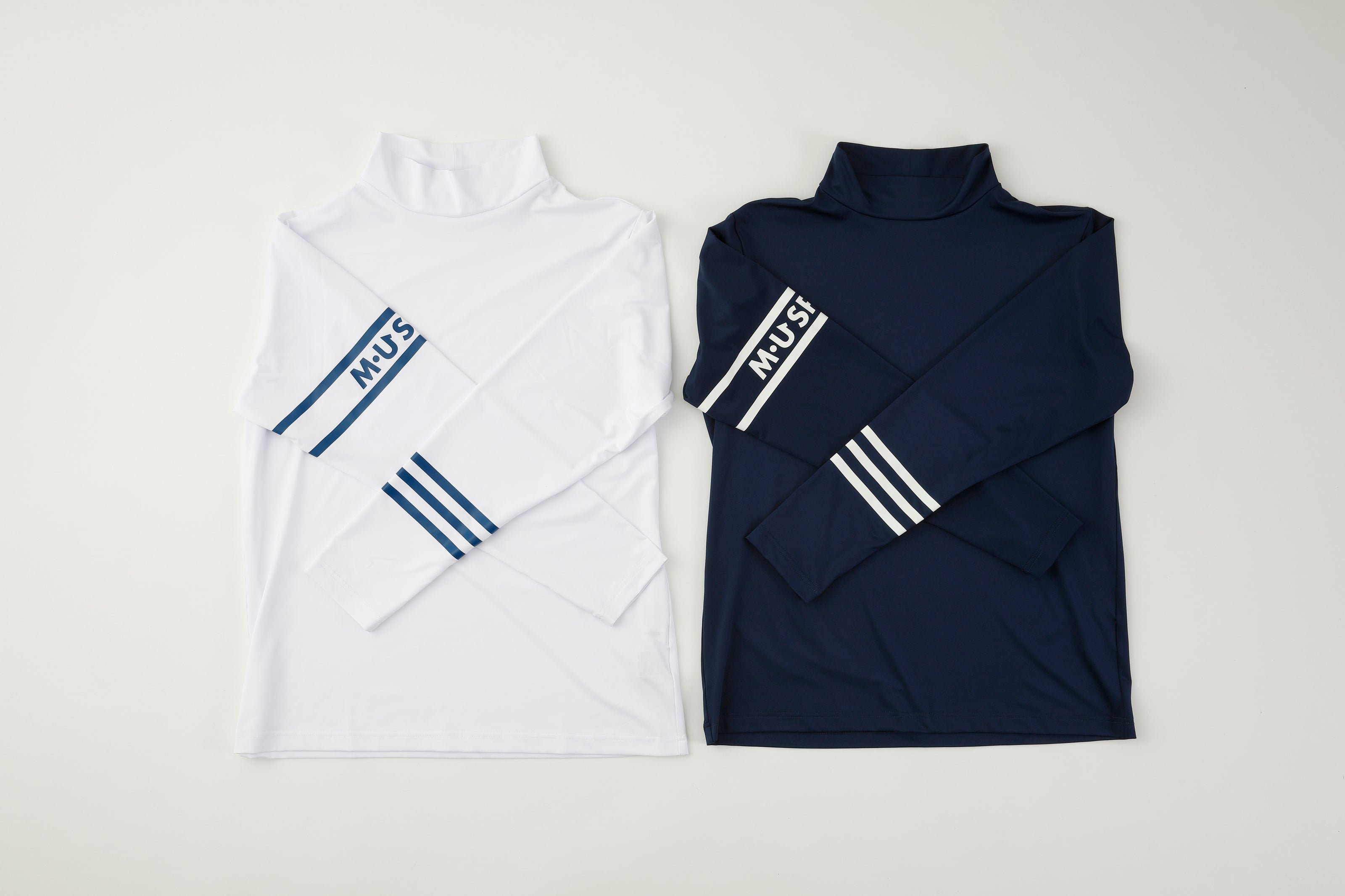 左右アシンメトリなボーダーや、ロゴプリントがアクセントポイントのモックネックはホワイトとネイビーのベーシックな2カラー展開でご用意しています。