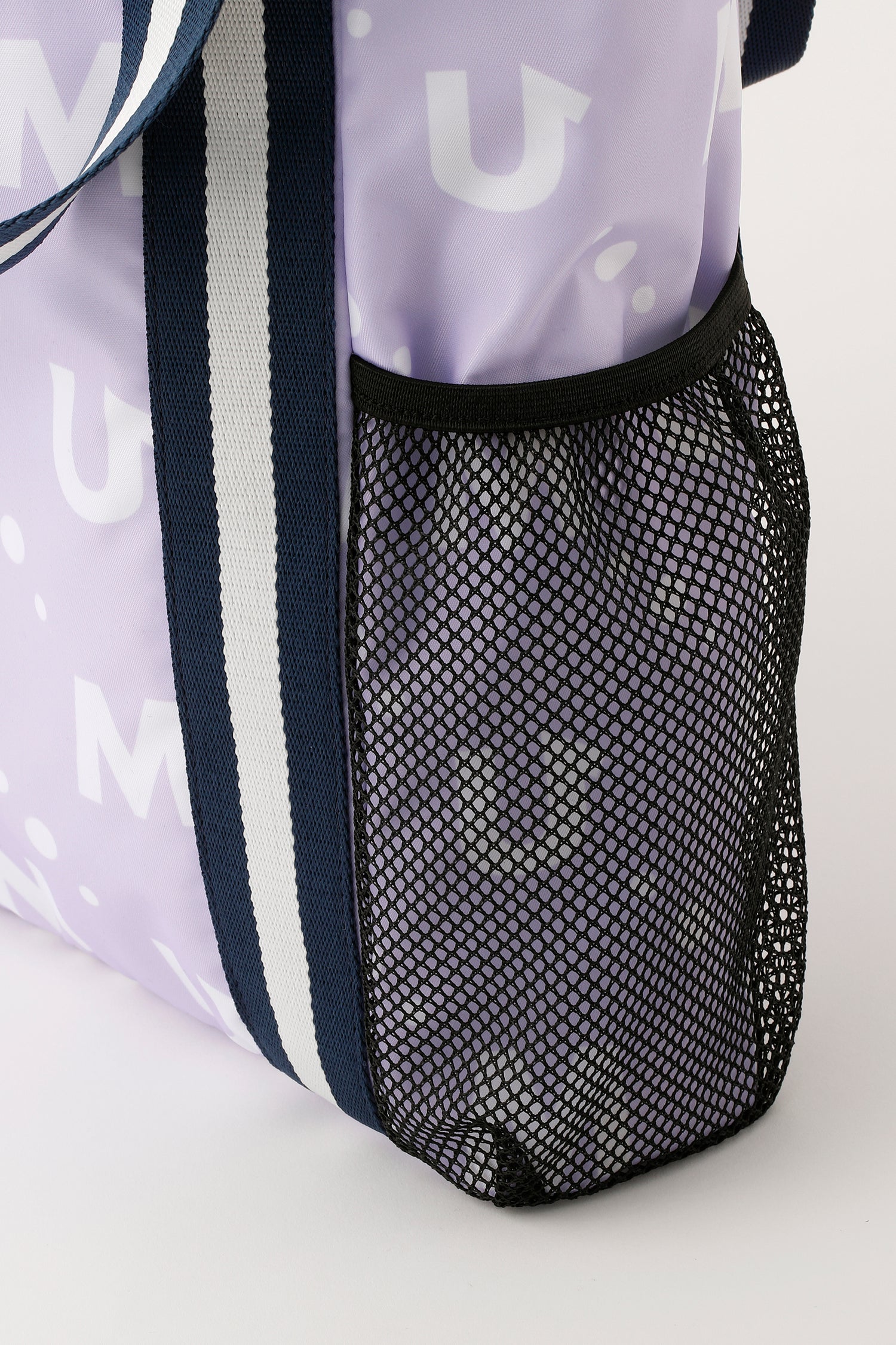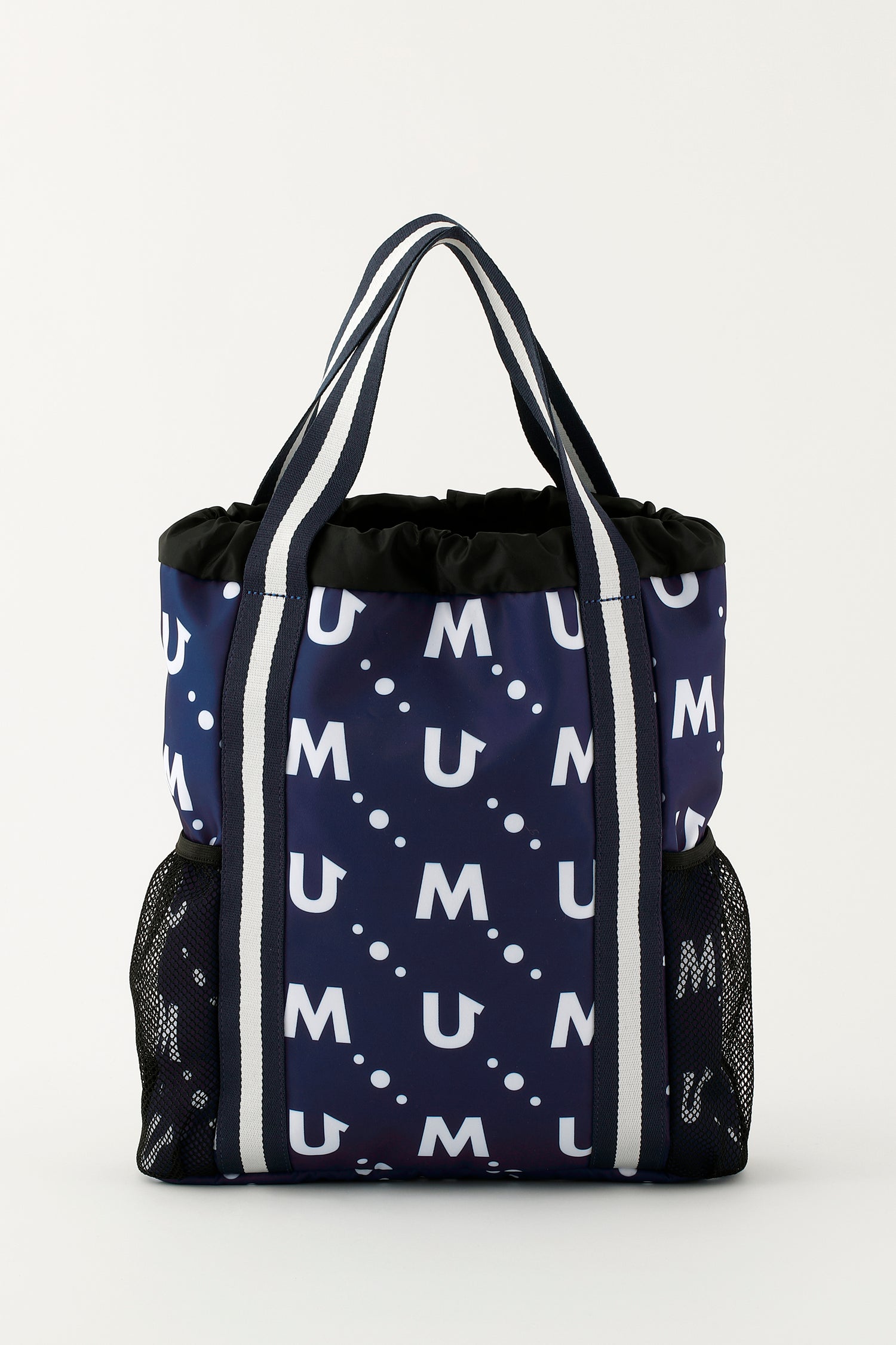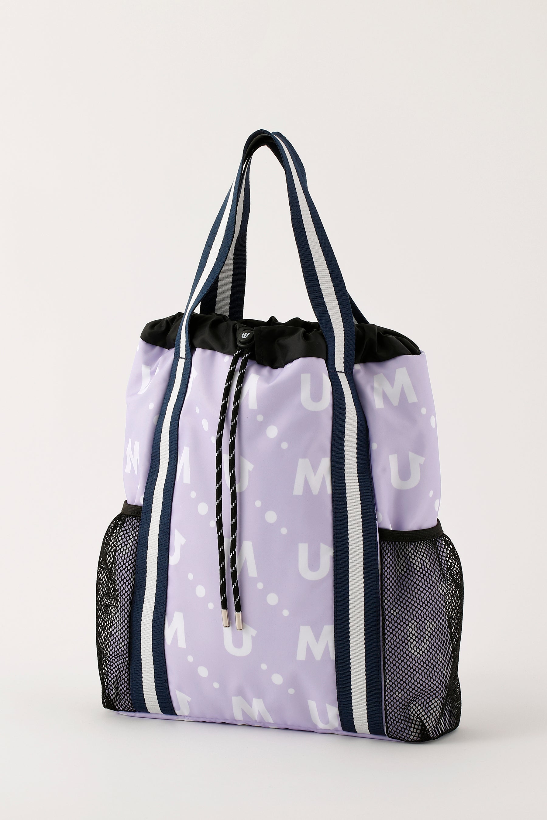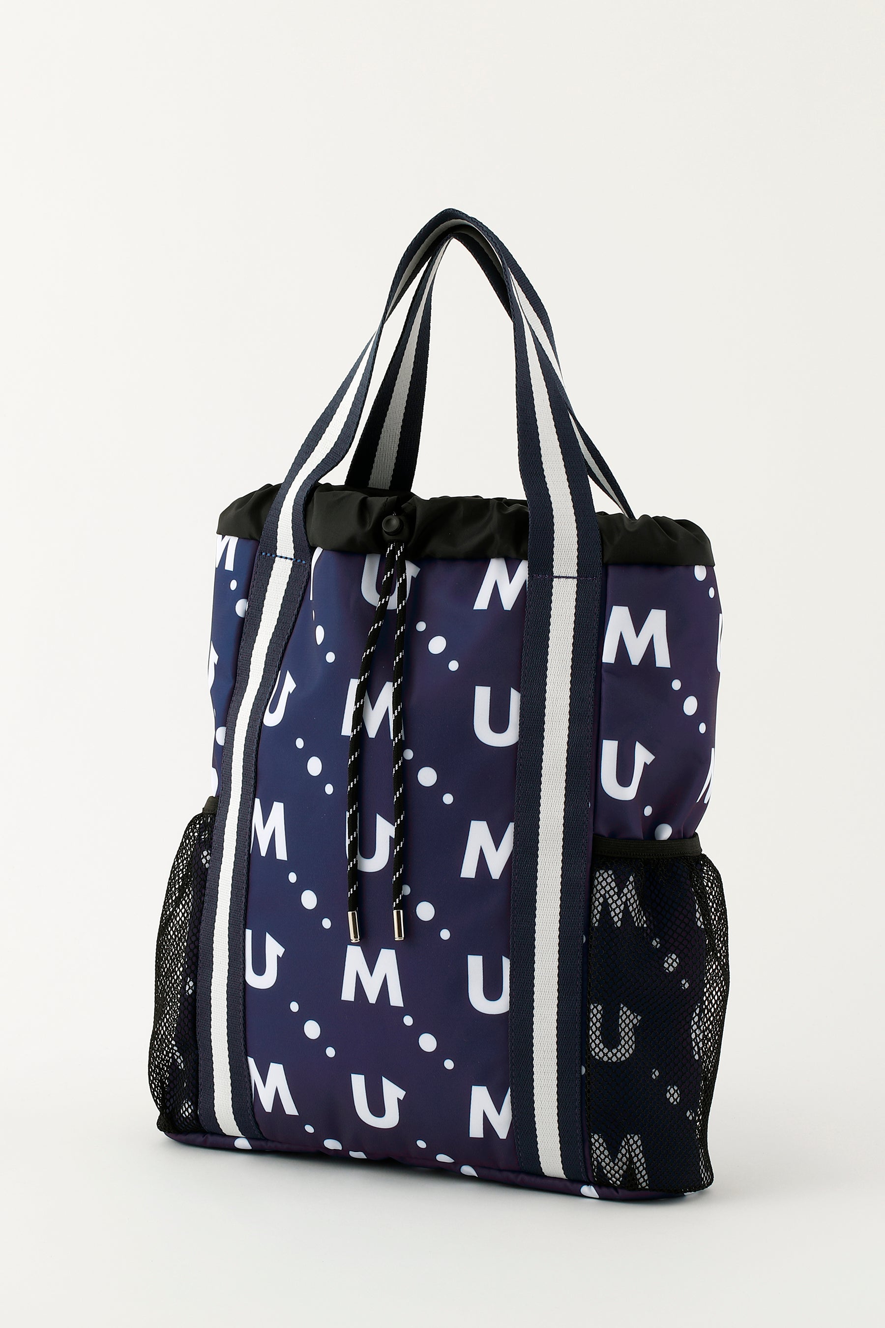 撥水素材のポリエステルツイルのモノグラム総柄プリントのメッシュポケット付き軽量マルチバッグ。