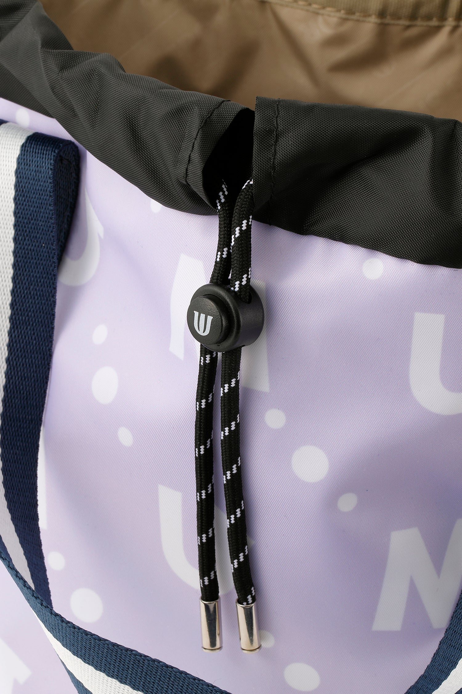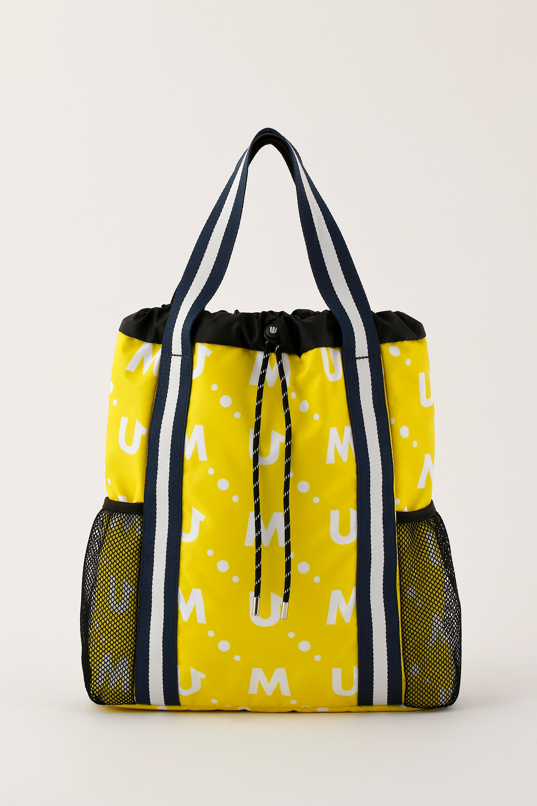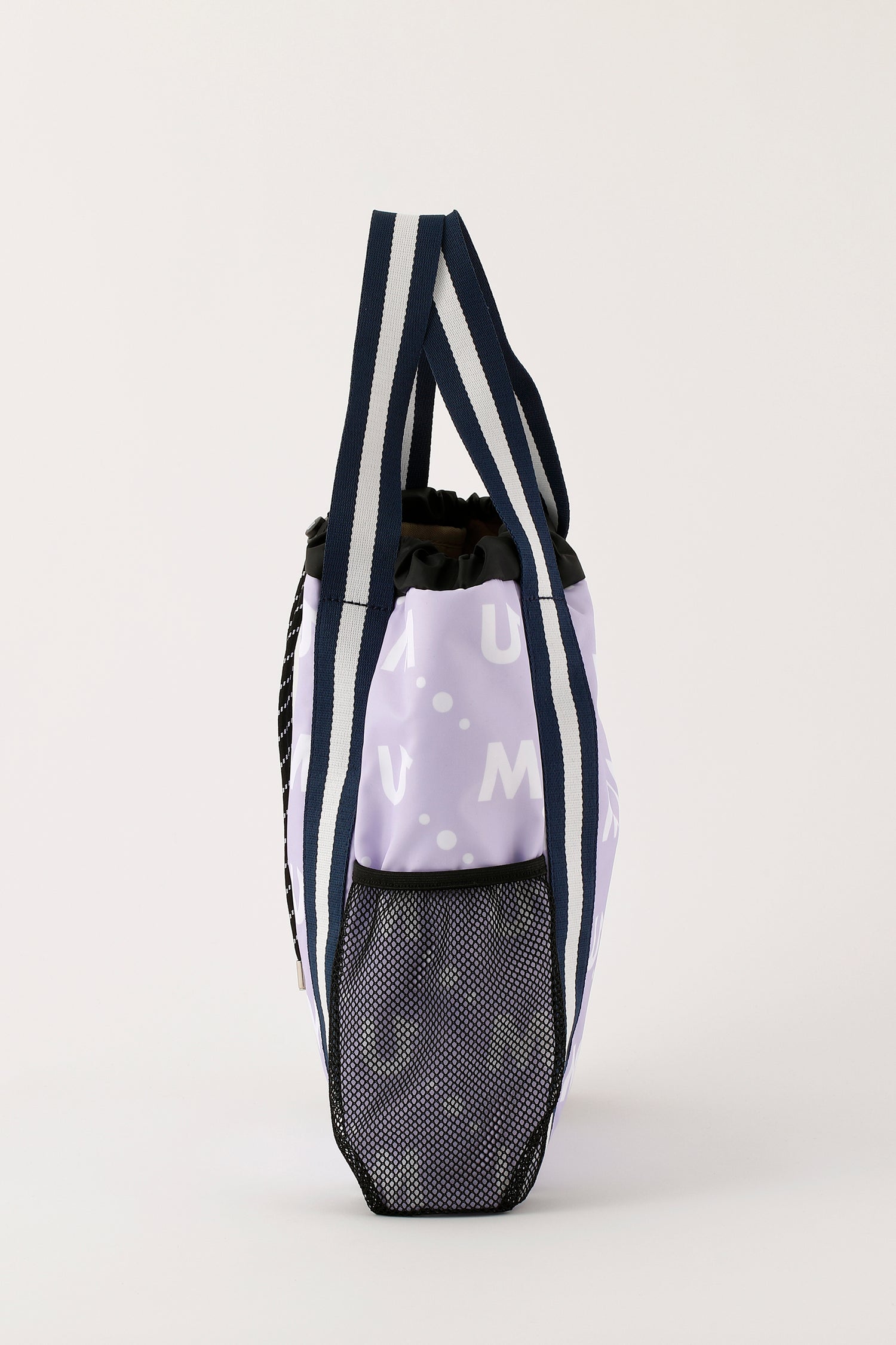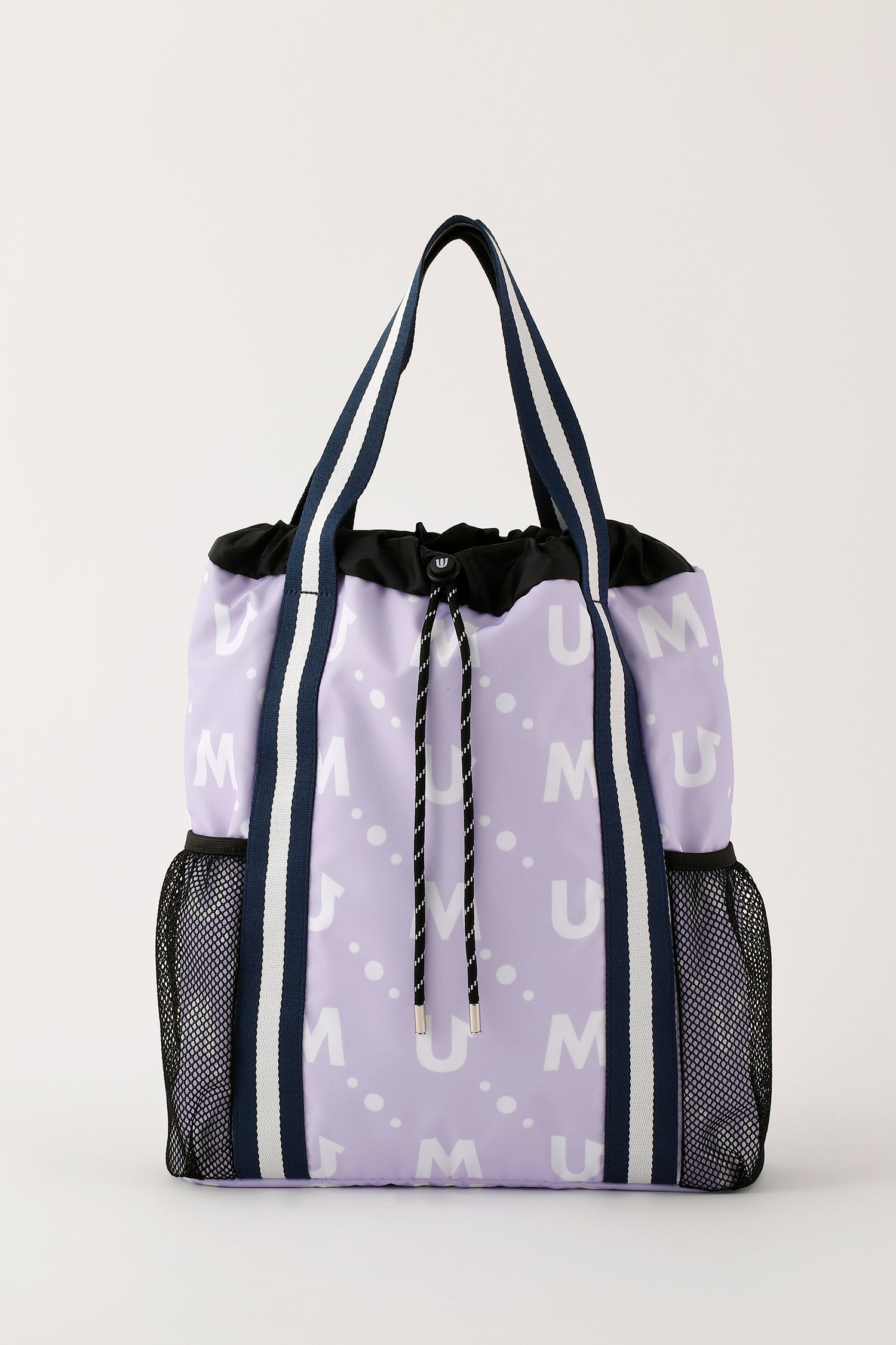 撥水素材のポリエステルツイルのモノグラム総柄プリントのメッシュポケット付き軽量マルチバッグ。
