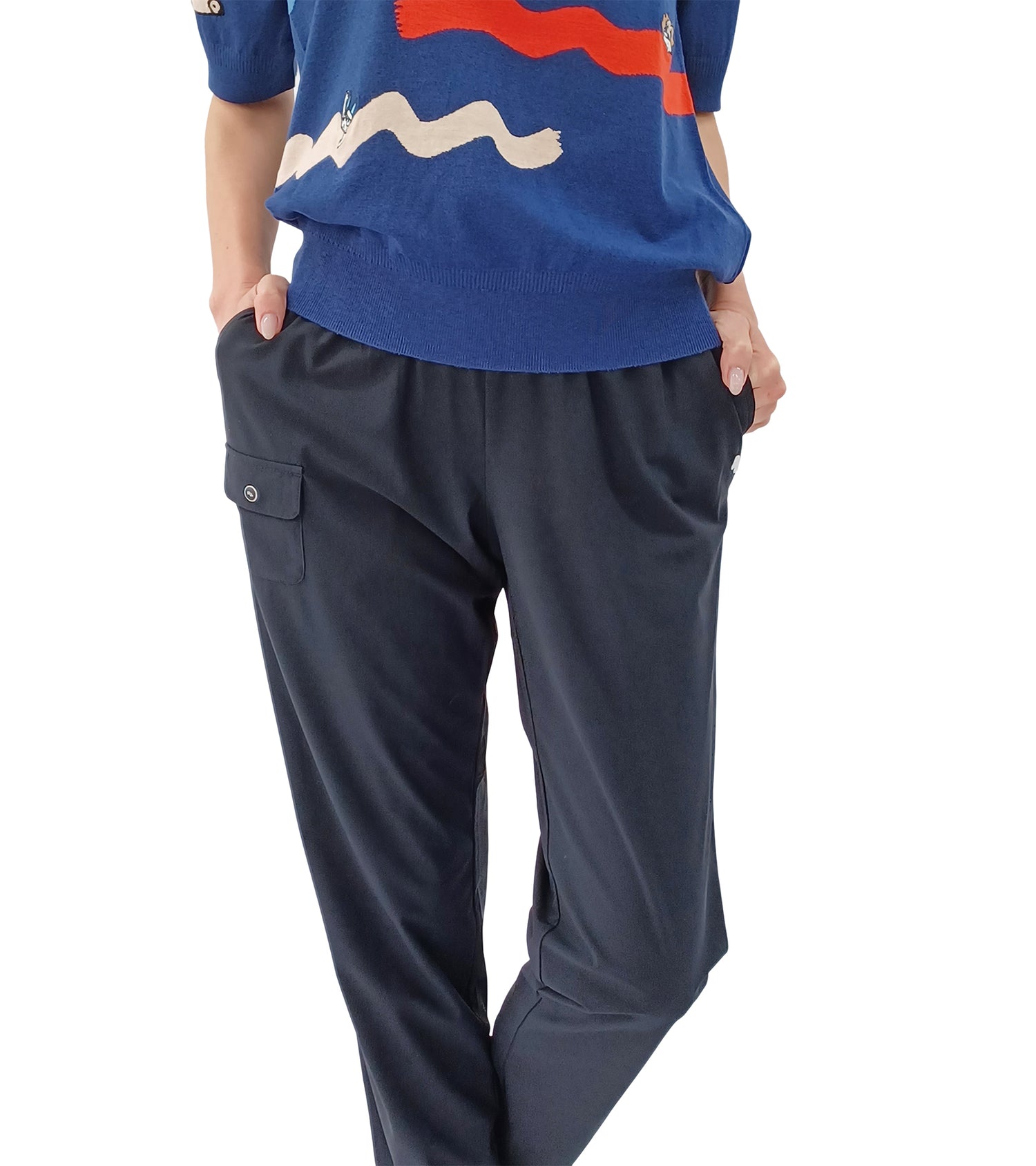 ウエストの仕様は、ベルトループと内側に紐を通しており、シーンに合わせて着まわせる1着です。ポケットはフロントサイドポケットとバックポケット、飾りポケットを施し、機能面・デザイン面も多機能です。
