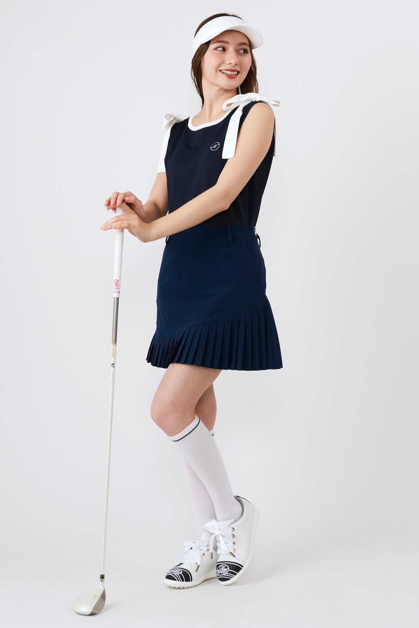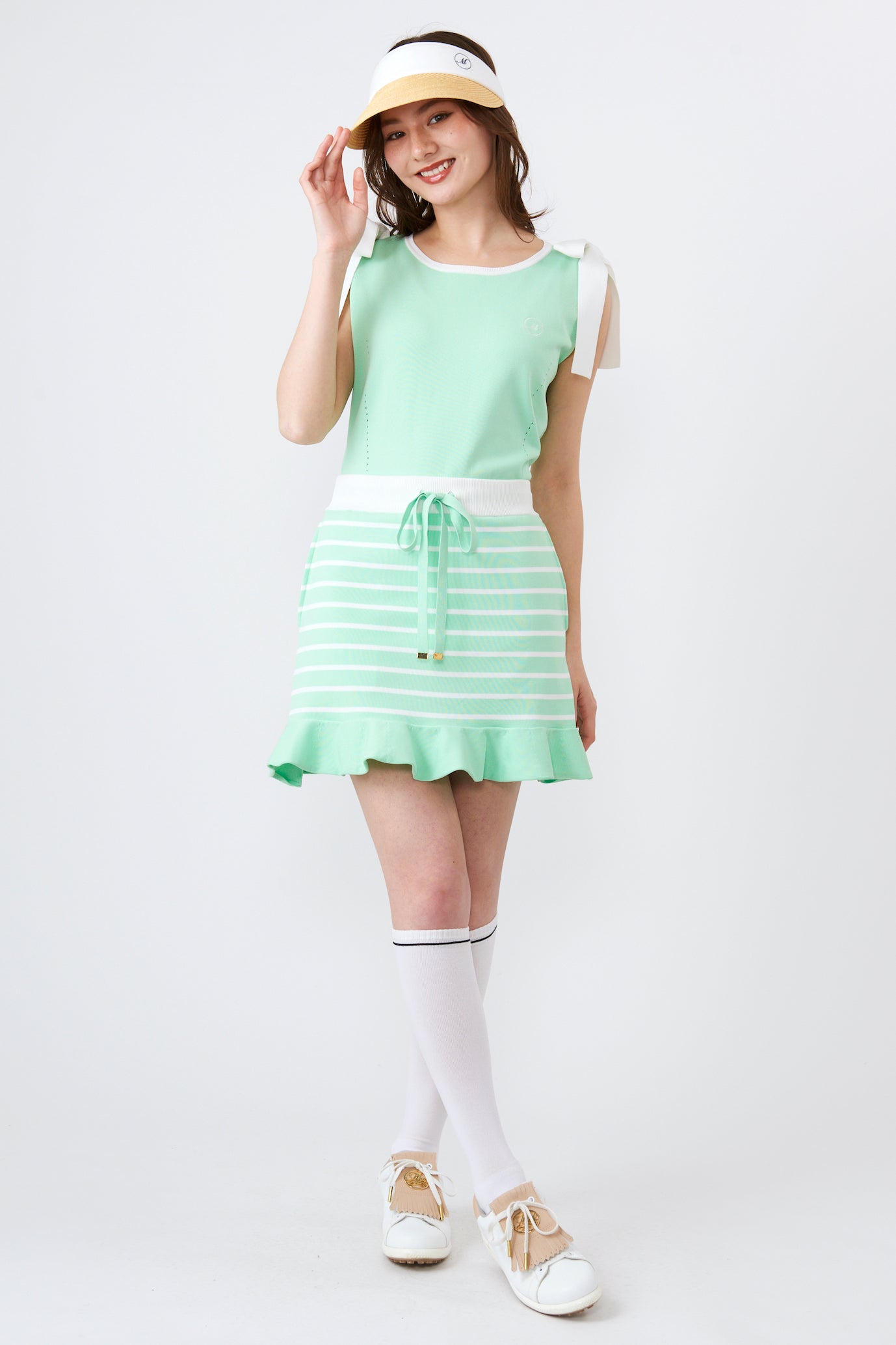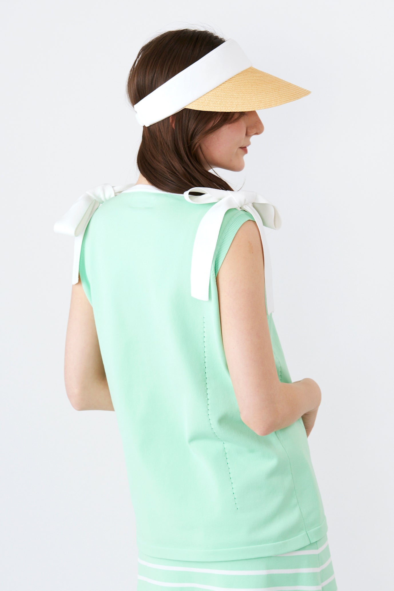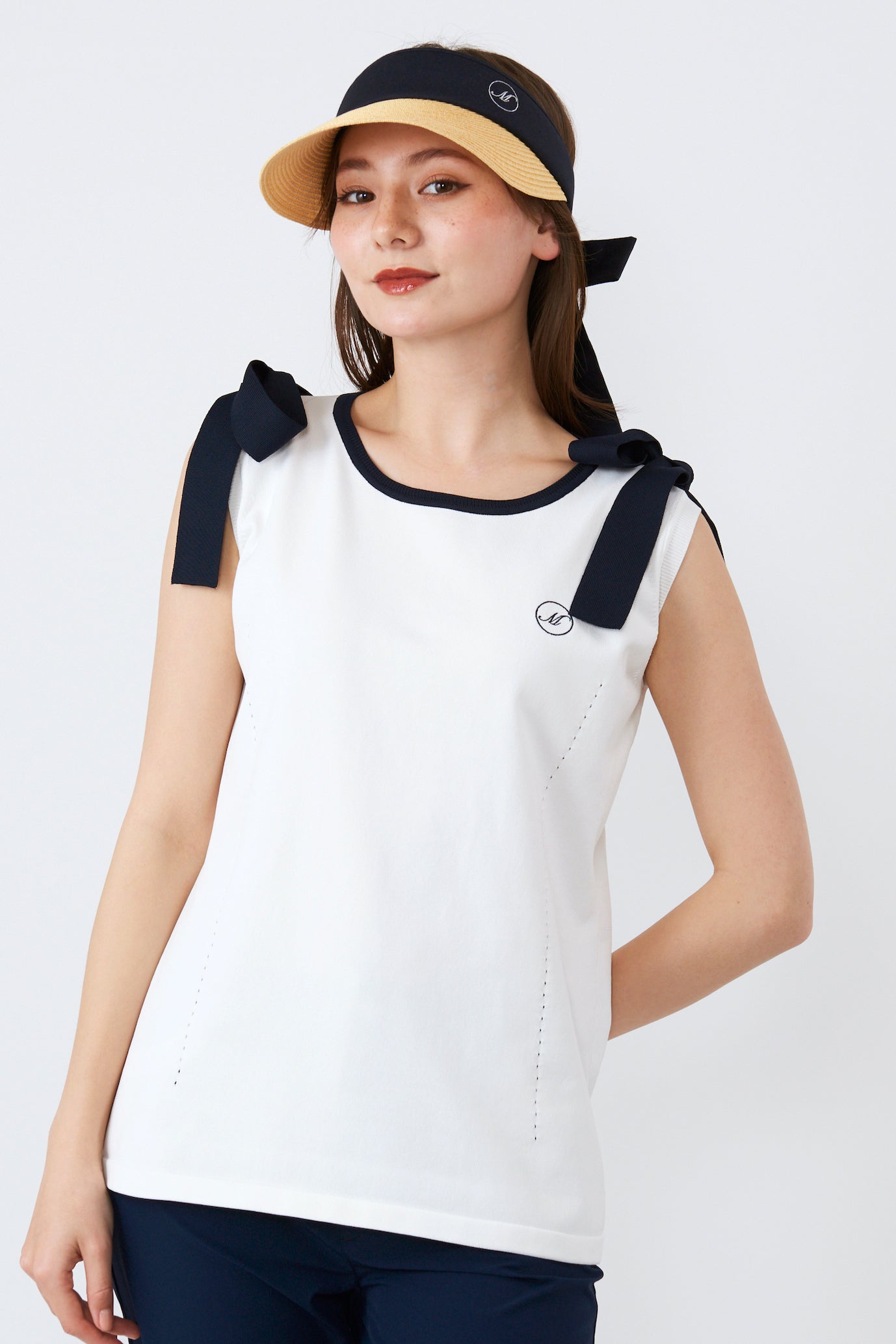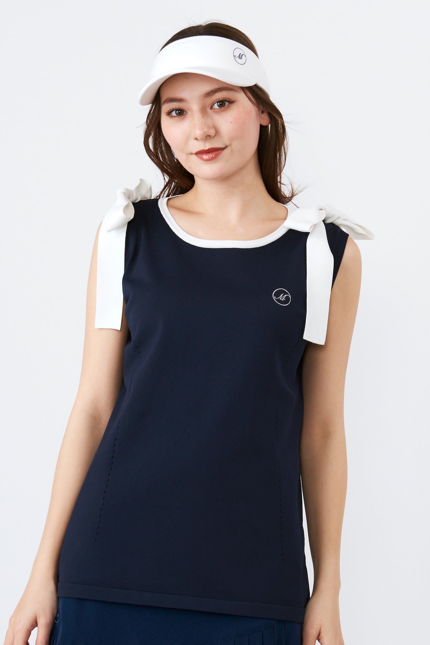 両肩に結ばれたリボンがとてもキュートなノースリーブニットです。