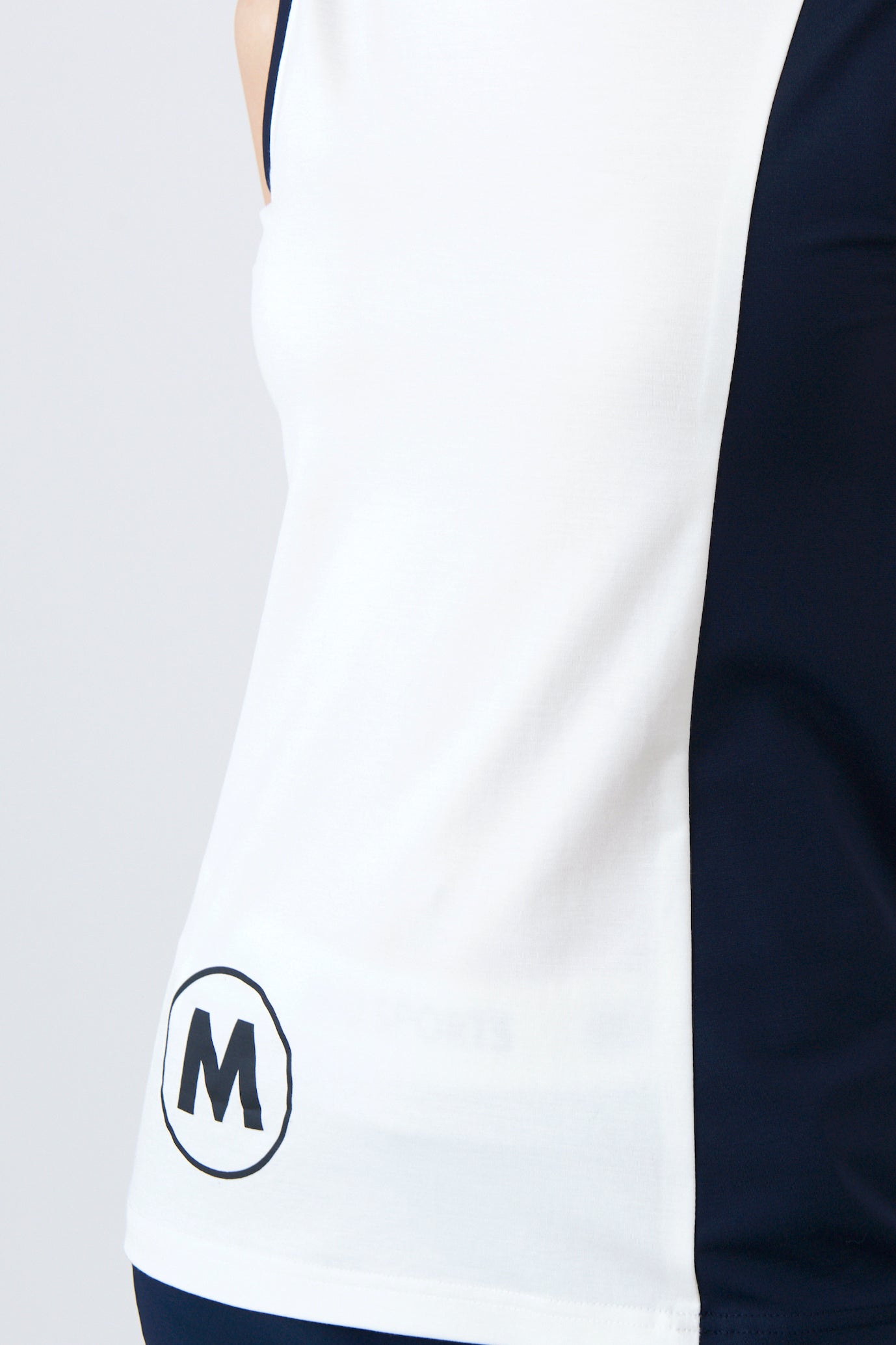 前身頃は大胆にバイカラーに切り替えられ、大きなロゴが裾に入ったスポーティーな一枚です。