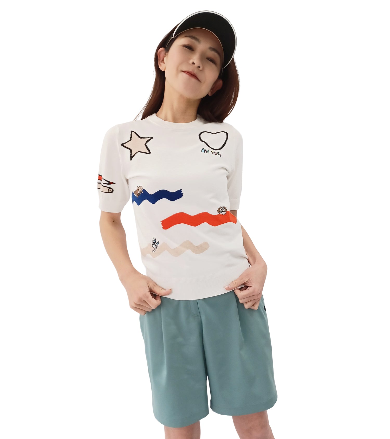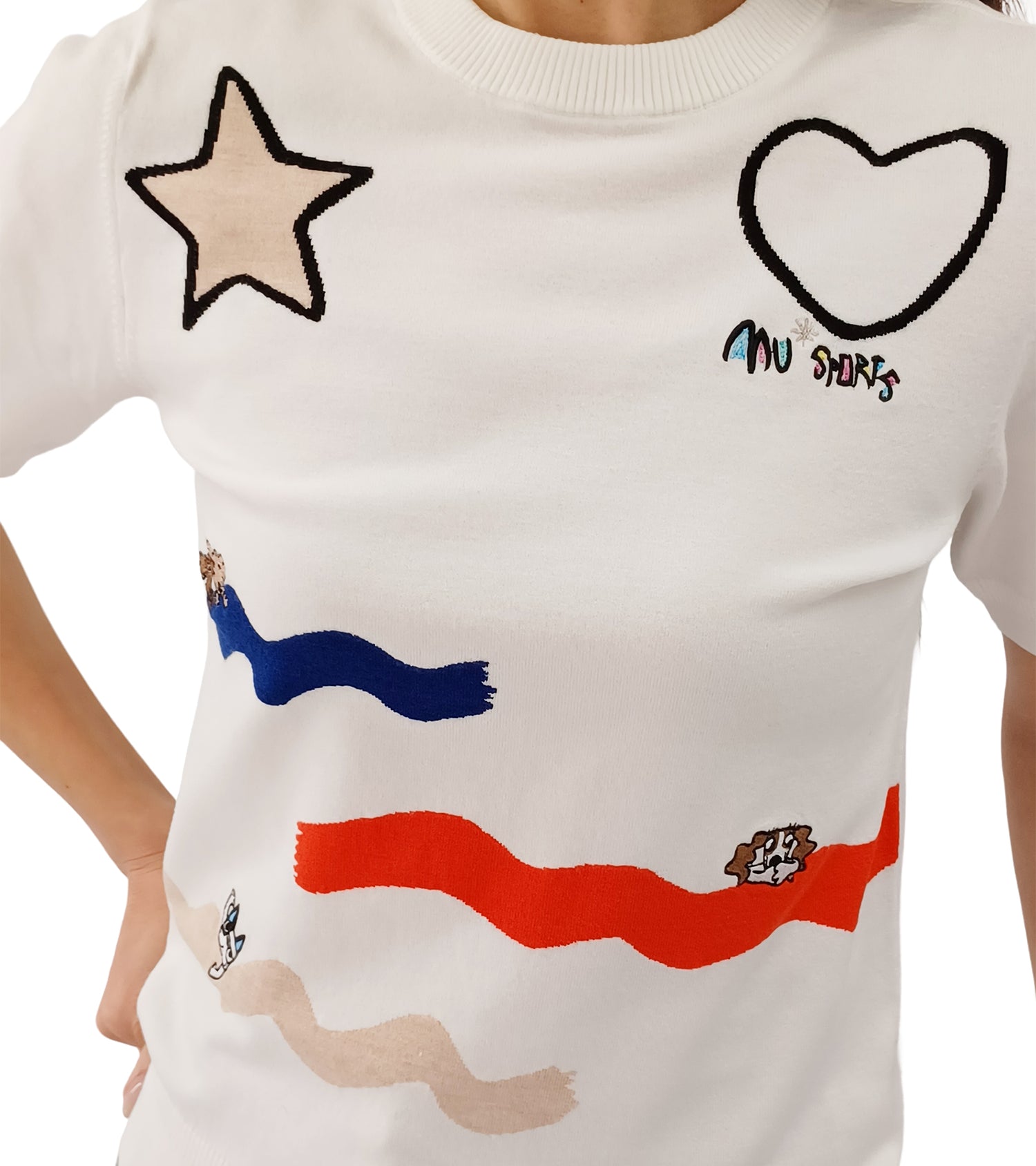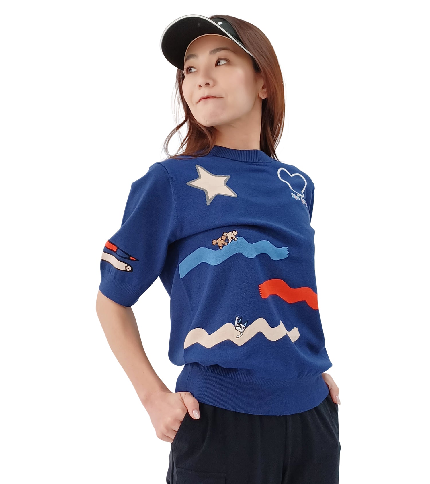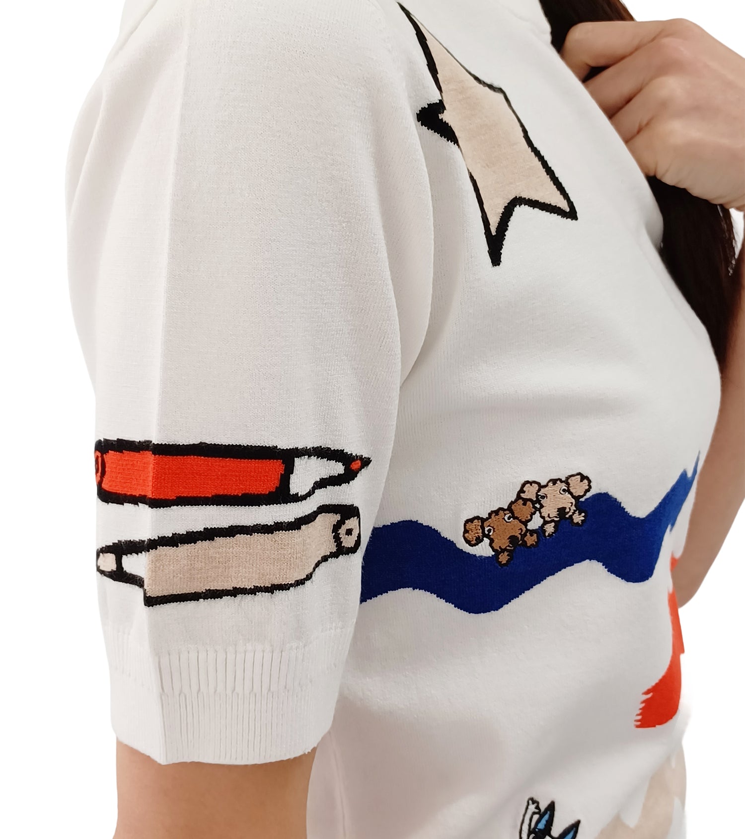 レーヨン混半袖クルーネックニットです。フロント部分はインターシャでカラフルな色使い、キャラクターを総動員し、一つ一つ刺繍で鮮やかに丁寧に施しております。