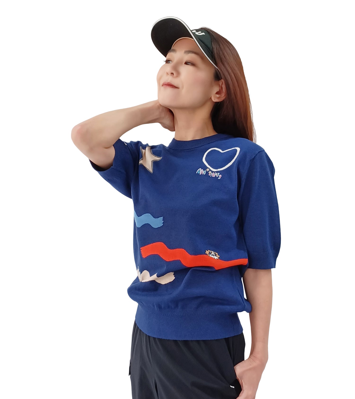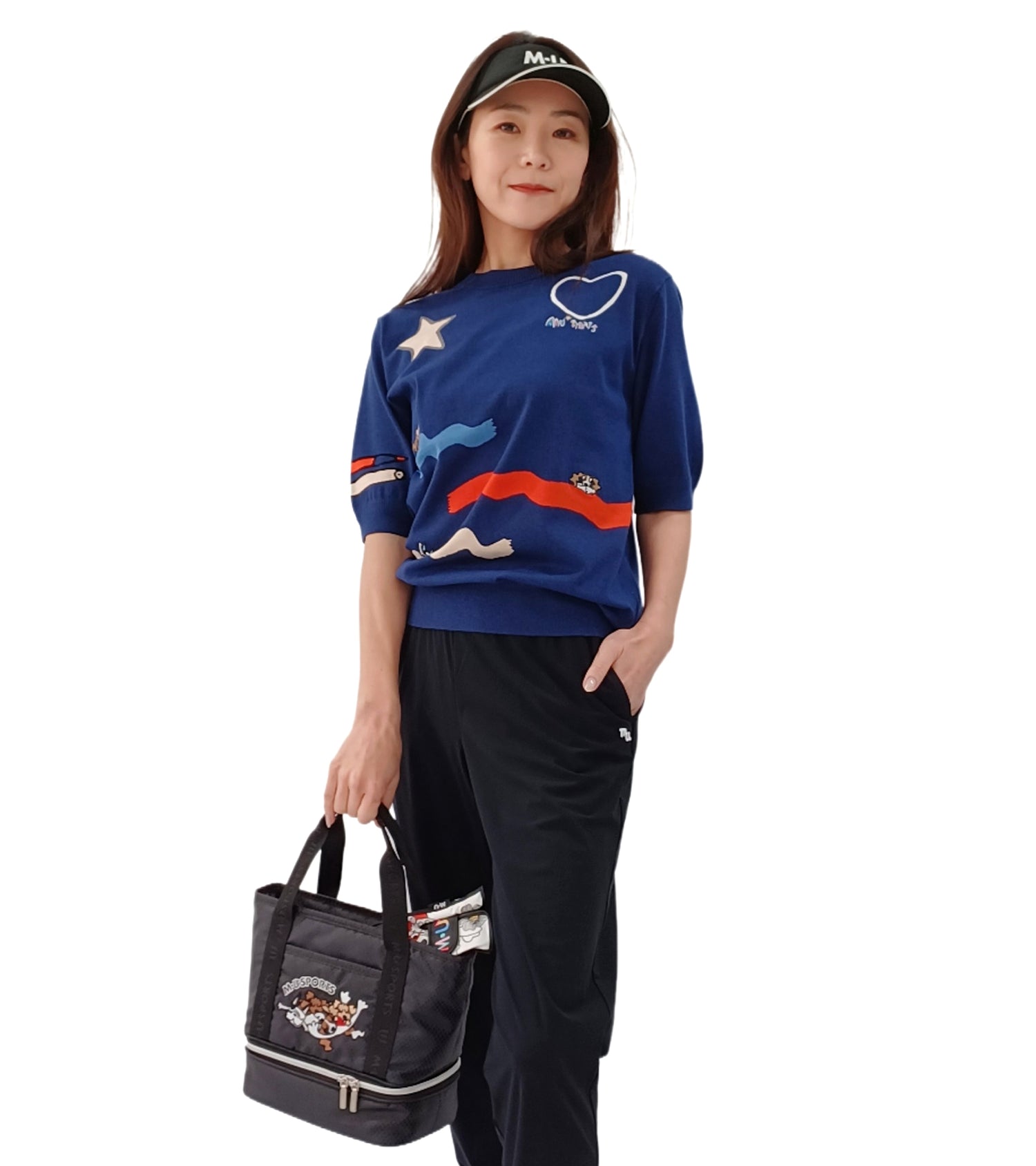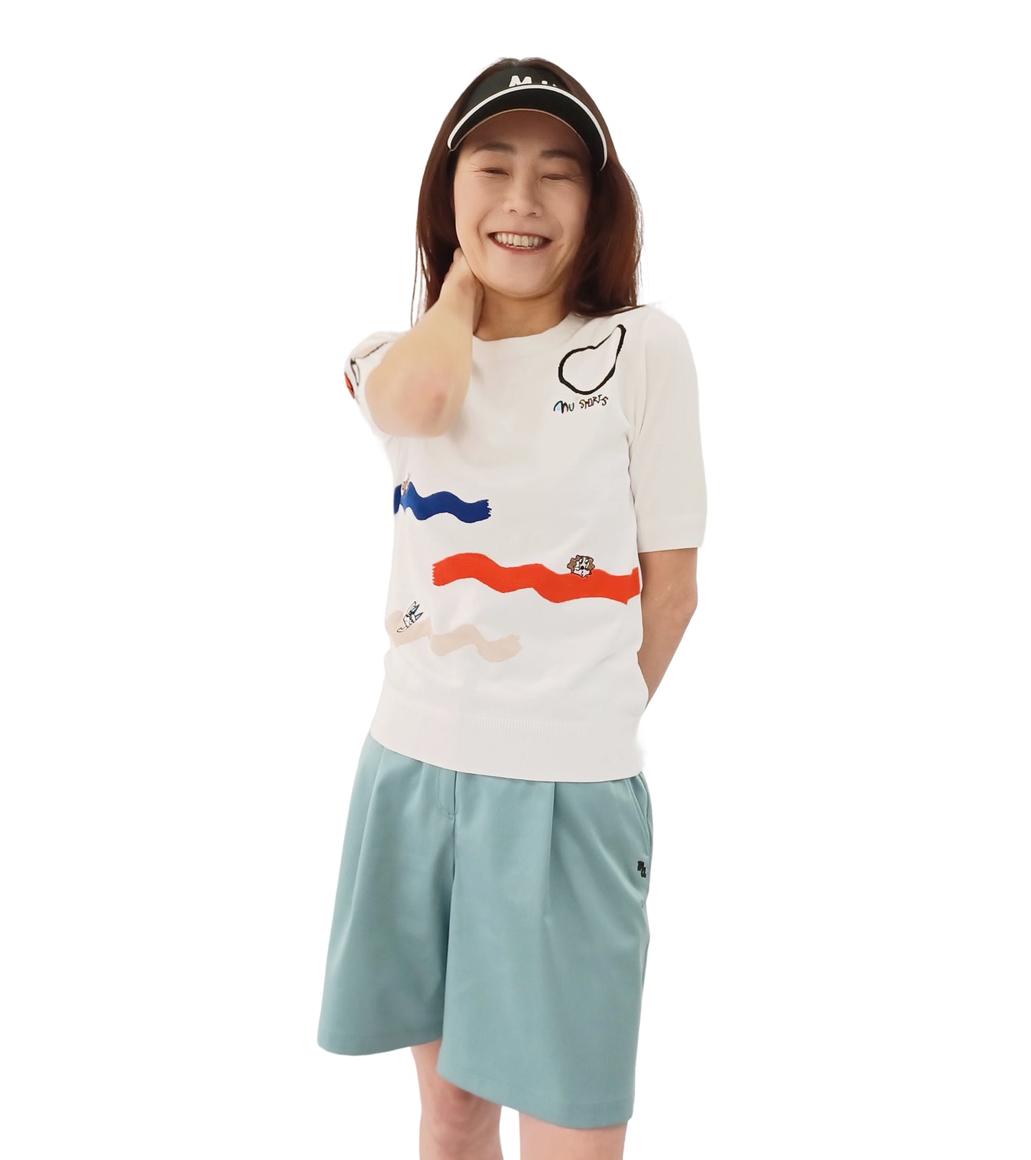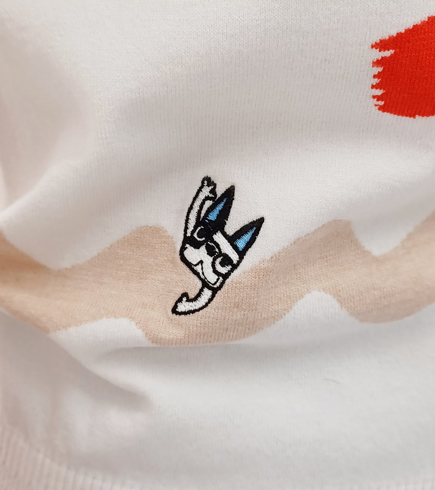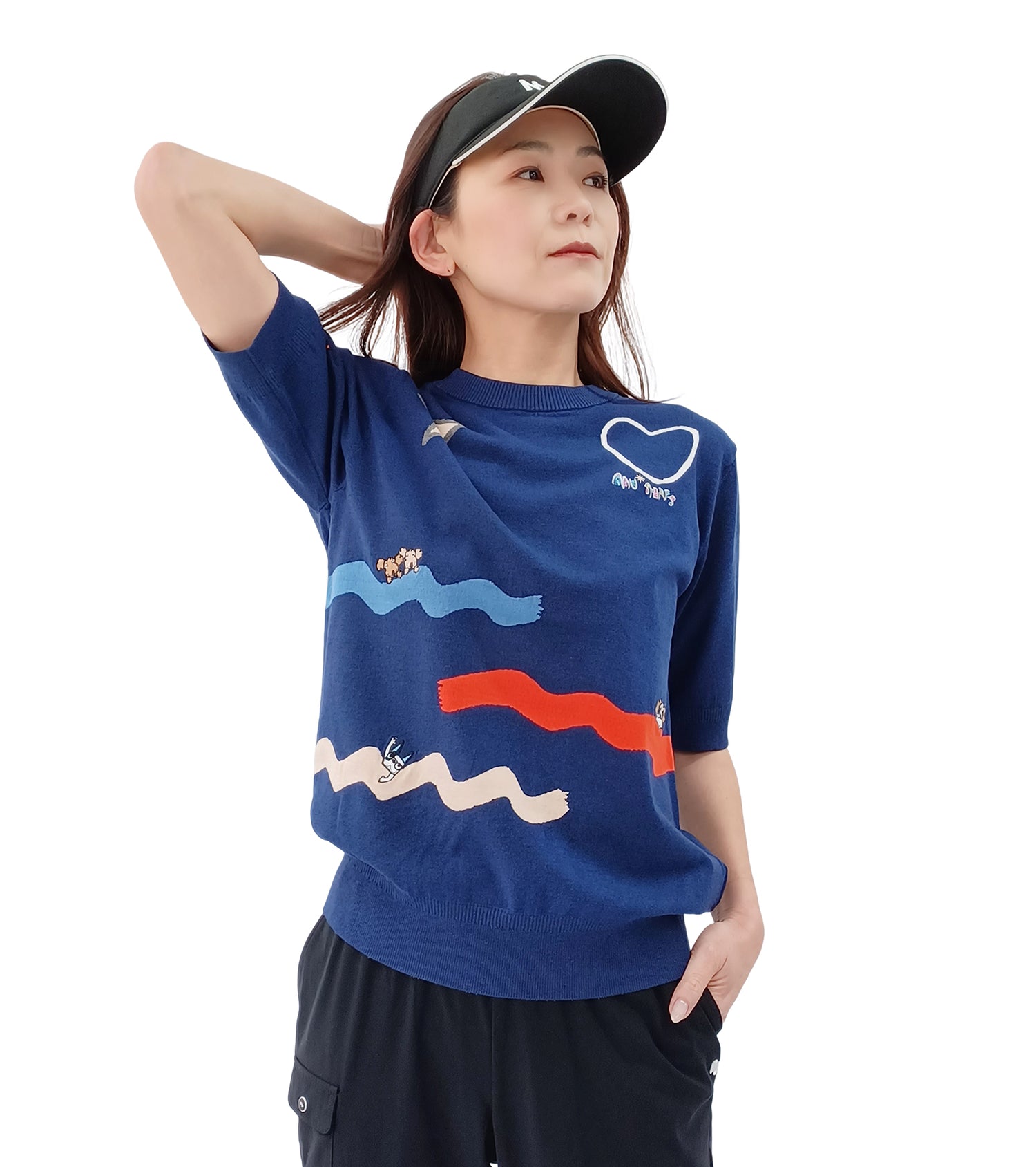 レーヨン混半袖クルーネックニットです。フロント部分はインターシャでカラフルな色使い、キャラクターを総動員し、一つ一つ刺繍で鮮やかに丁寧に施しております。