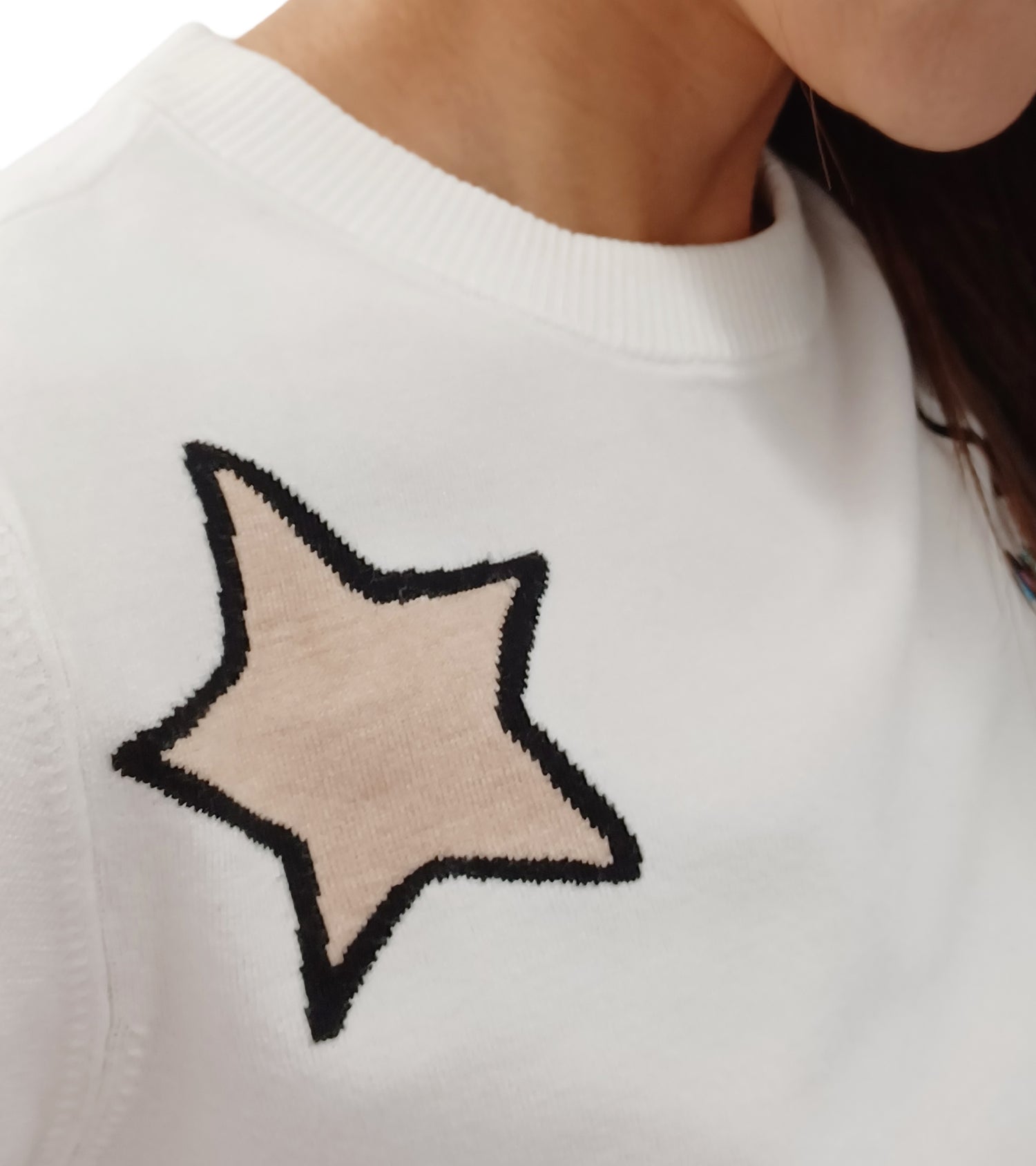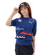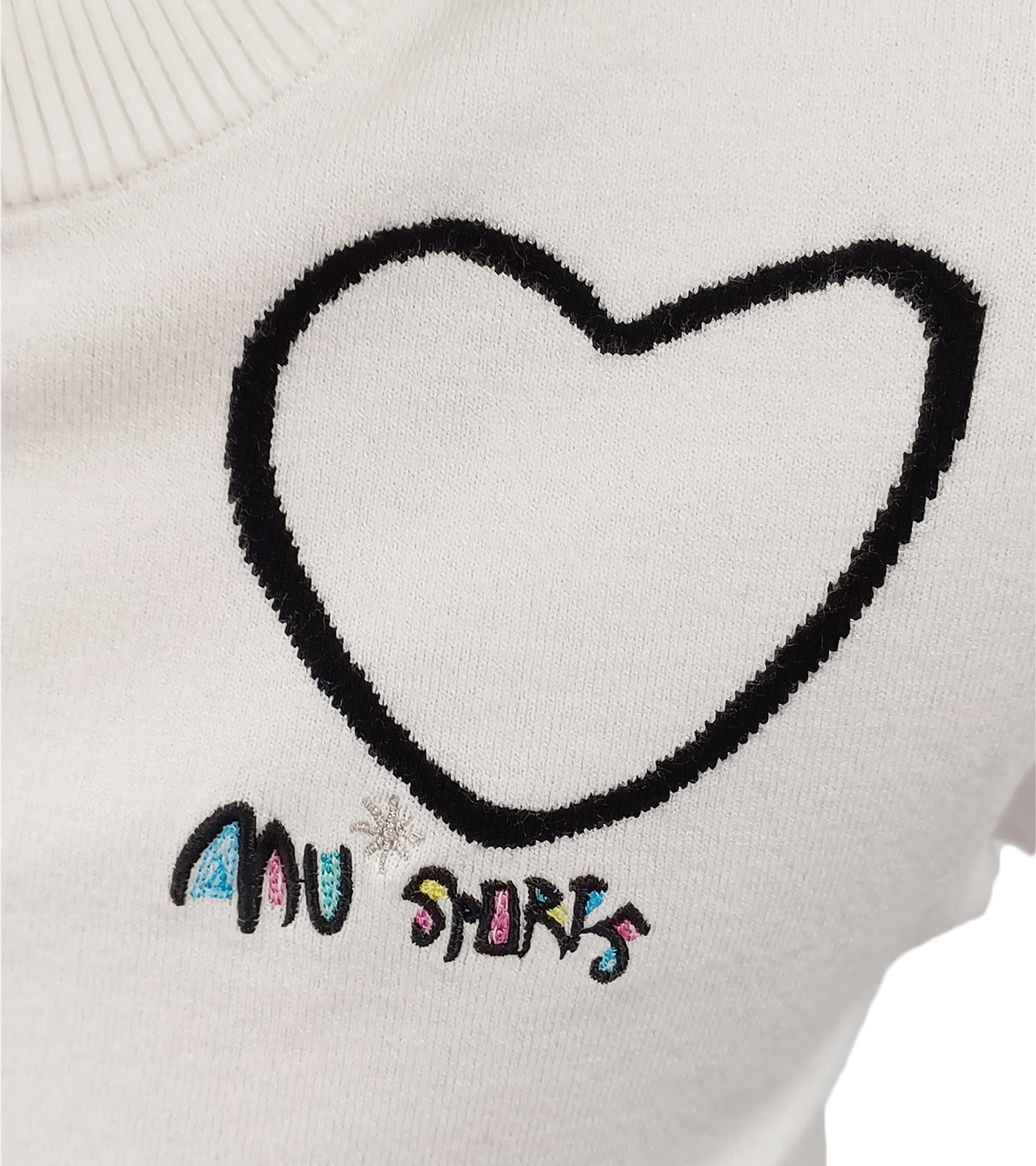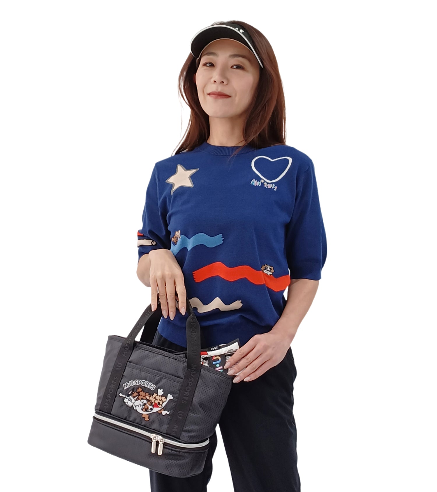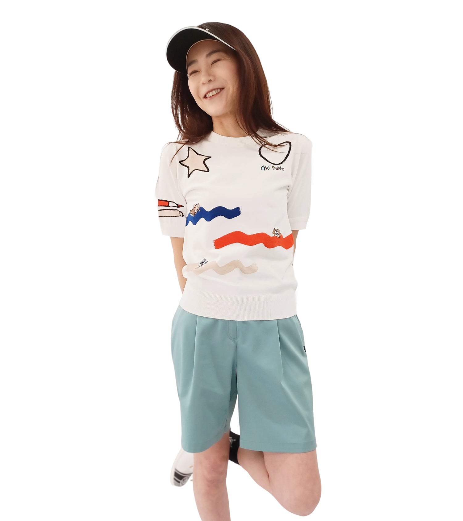 レーヨン混半袖クルーネックニットです。フロント部分はインターシャでカラフルな色使い、キャラクターを総動員し、一つ一つ刺繍で鮮やかに丁寧に施しております。