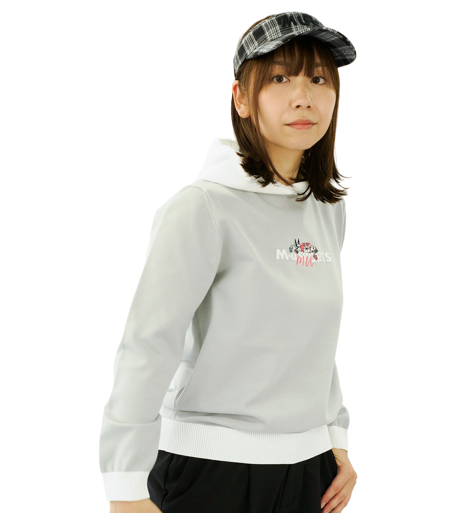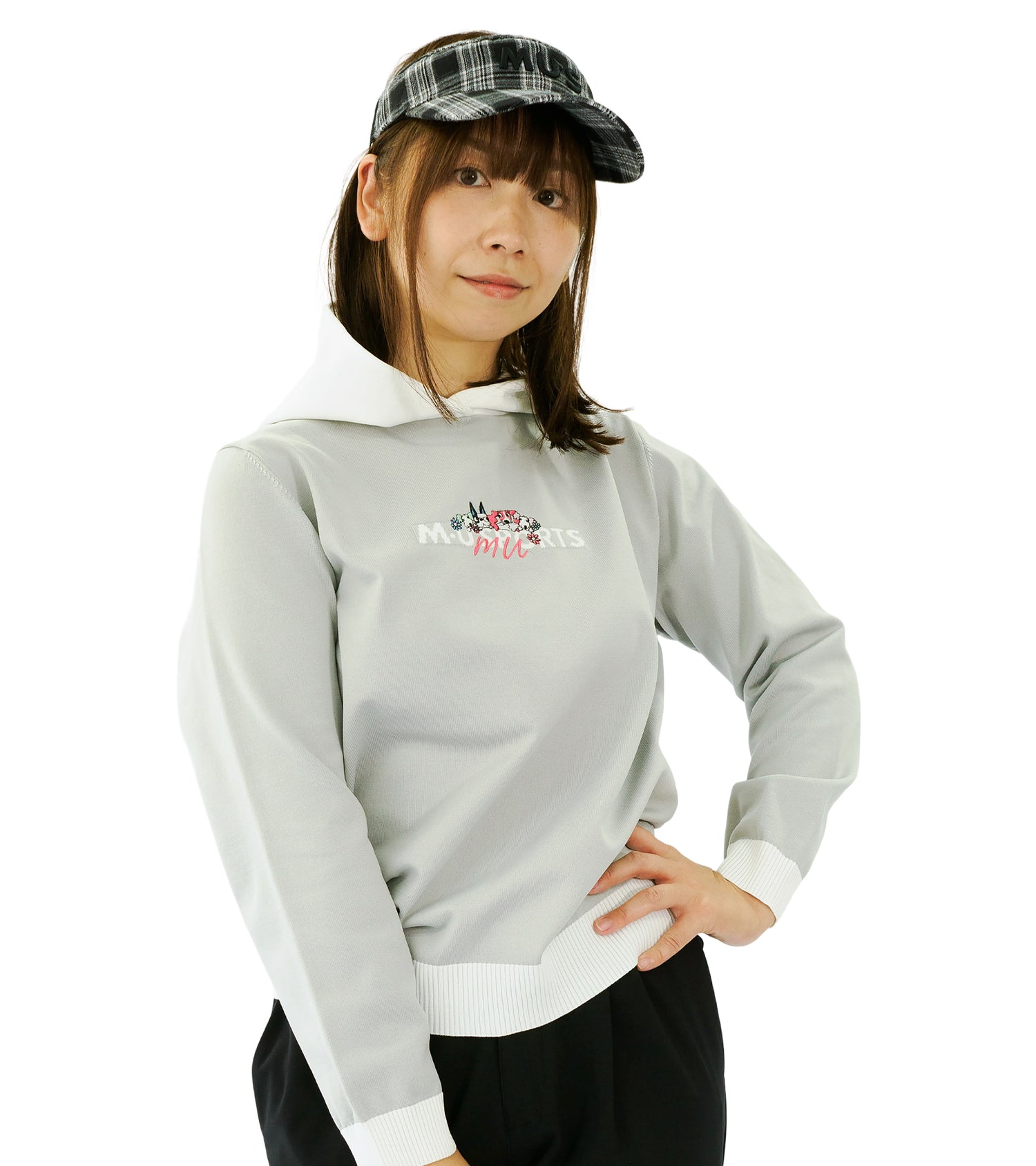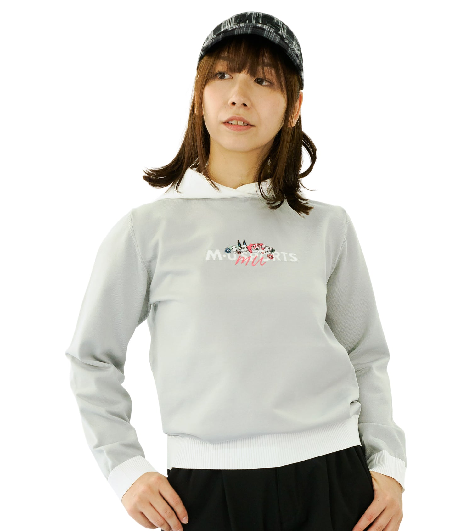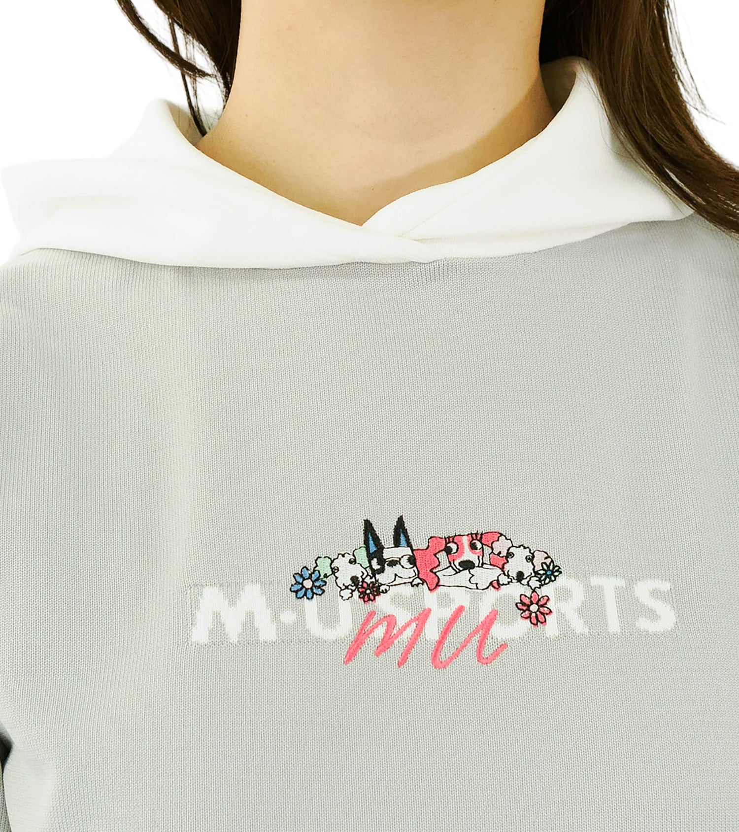 表面がカットソーのように見え、すっきりとした天竺編みを採用したフード付きセーター。前面中央のモチーフは、二次加工されたカラフルな刺繍で全キャラクターが集合しており、デザインに楽しいアクセントを加えています。