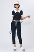 修身九分褲。雖然它具有漂亮的修身剪裁,但它採用高張力面料,提供無壓力的舒適感。口袋開口和腰帶上貼有飾邊膠帶,使其成為一款簡單而可愛的單品,帶有女性化的細節。